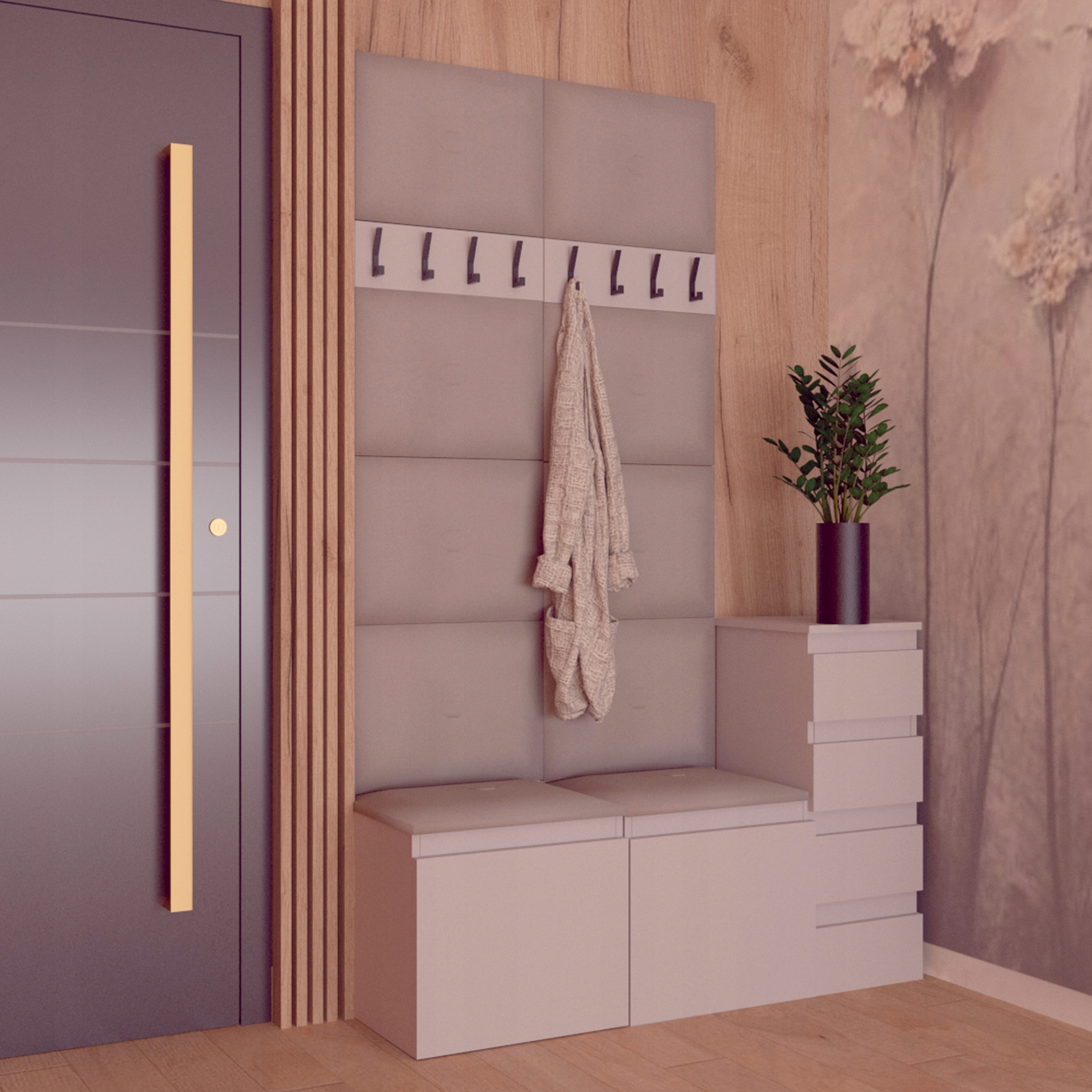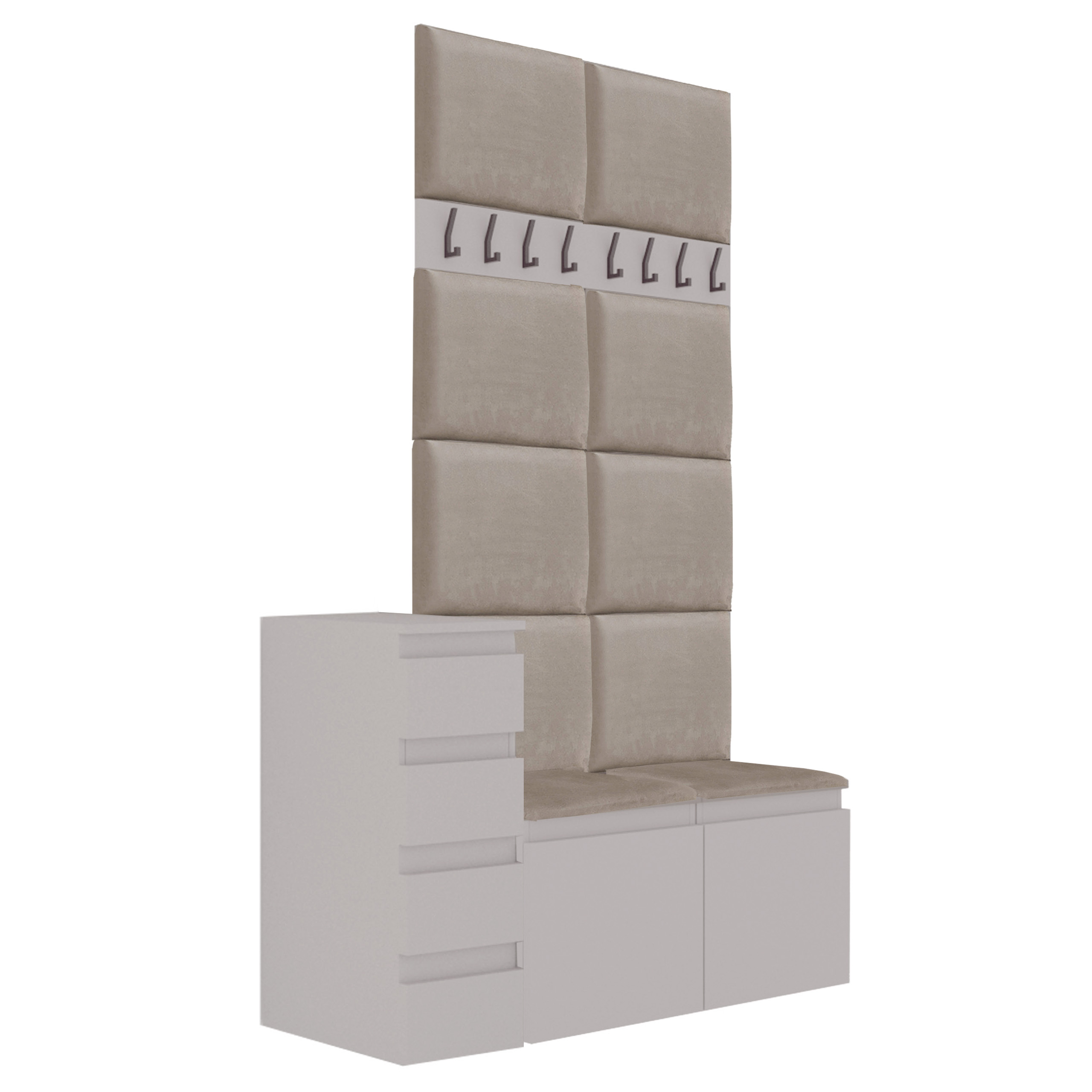 Модульні м'які панелі зроблять ваш інтер'єр надзвичайно затишним. Ви можете встановити їх , наприклад у передпокої, створюючи приємний куточок у вашому домі. Використовується у шафі взуття Megan 2. Панелі виготовлені з ламінованої пластини, оббивки 3 см і високоякісної тканини у кількох модних відтінках. Загальна товщина панелі - 5 см.
