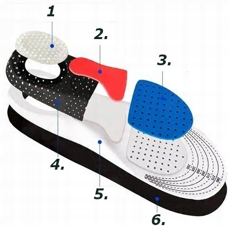 Інноваційні ортопедичні устілки для взуття з шаром піни товщиною 3 мм. Шар піни ефективно розсіює до 95% ударів, що виникають під час кожного кроку, особливо на твердих поверхнях.