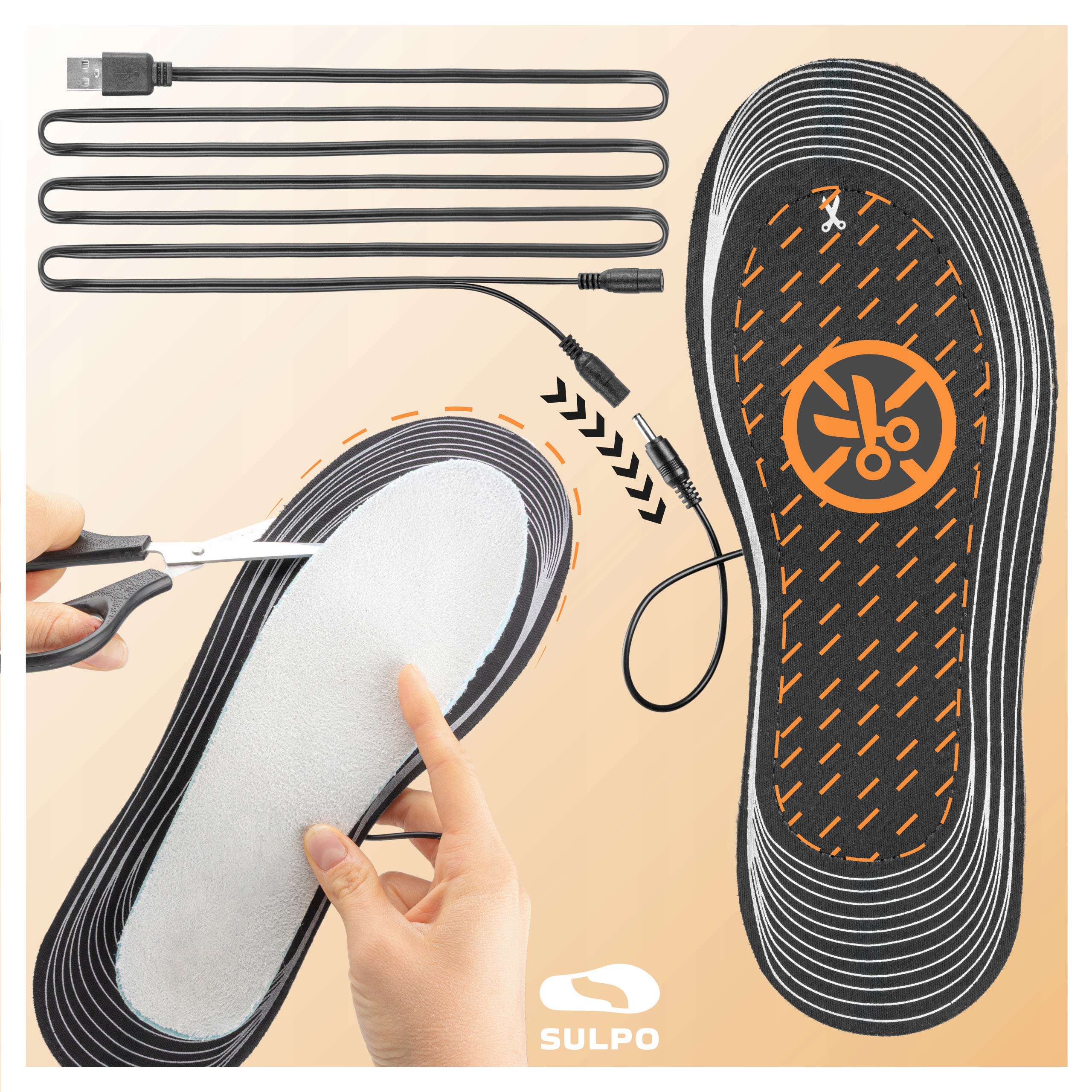 SULPO - це передові устілки з функцією підігріву стопи - ідеальні для зимових прогулянок, гірських експедицій, катання на лижах, риболовлі або повсякденного використання. Вони живляться від USB (наприклад, Power Bank - ⛔ не входить у комплект), вони швидко нагріваються (лише за 3 хвилини!).