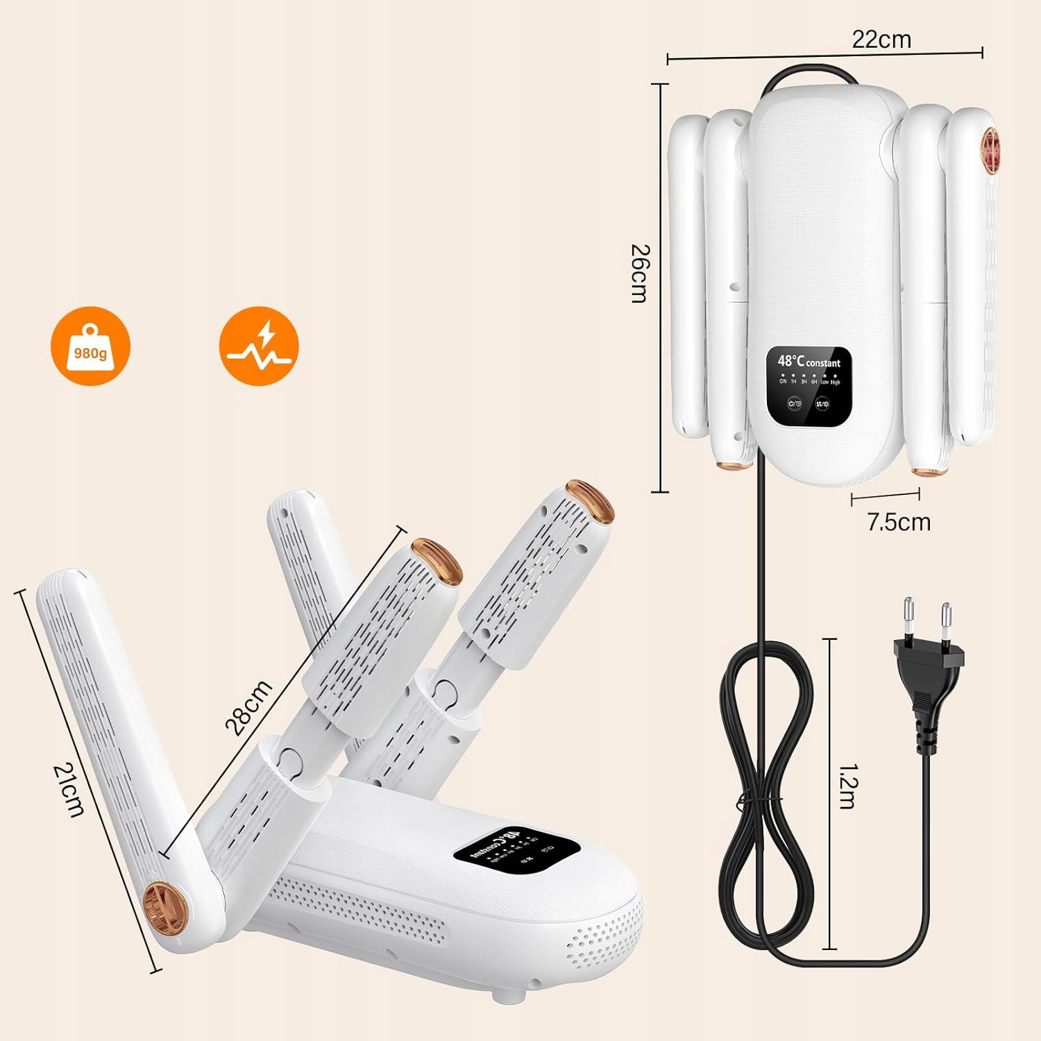 - - Він має дві пари сушильних рук, які можуть сушити дві пари взуття одночасно. Один із плечей телескопічний для адаптації до різних розмірів взуття.