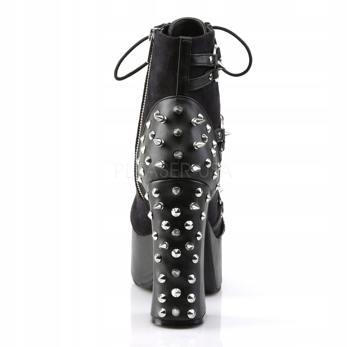 Чорні ботильйони на шнурівці CHARADE-100 із шипами та пряжками виготовлені з веганської шкіри та доступні в розмірах від 36 до 42. Вони чудово поєднуватимуться зі стилями рок та панк, більш гострими стилями з латексу та шкіри та будь-якими видами одягу. костюми для альтернативних шоу, фільмів, фотосесій та ігор. Ці унікальні черевики підкреслять ваш завзятий характер і рішучу індивідуальність!