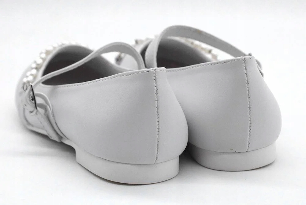 взуття для спілкування дівчат в білому кольорі. Бальеріни для причастя виготовлені з комфортних еко -лівих, внутрішньої вставки з натуральної шкіри. Додаткове кріплення на срібній пряжці з ременем, щоб взуття не падало з ноги. Прекрасне застосування з перлами та цирконами всередині спереду. Біла підошва, виготовлена з зручної та міцної гуми. Низький п’ят. Білі балерини чудові як взуття для причастя, а також пізніше, як взуття для дівчат на весілля.