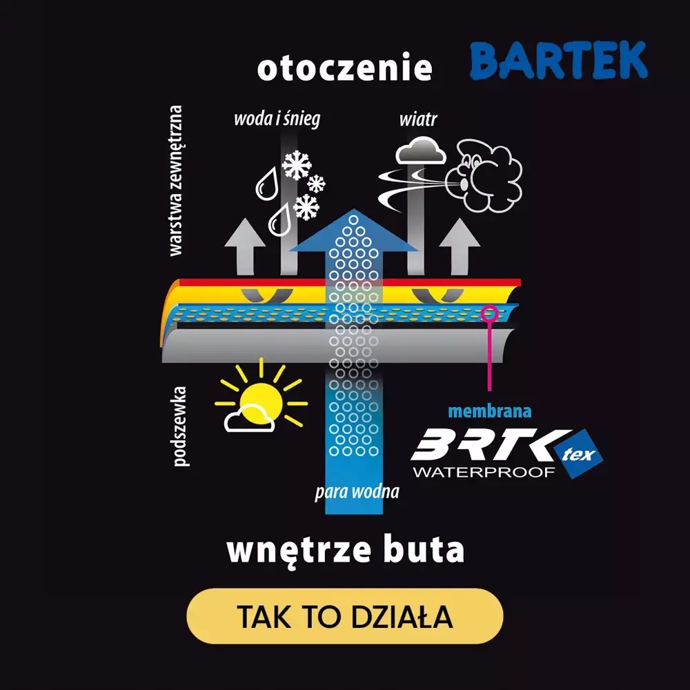 - Водонепроникна мембрана BRTKtex забезпечує сухість усередині взуття, оскільки не дозволяє пропускає вологу ззовні, і водночас дозволяє водяній парі, зібраній у взутті, виходити назовні.