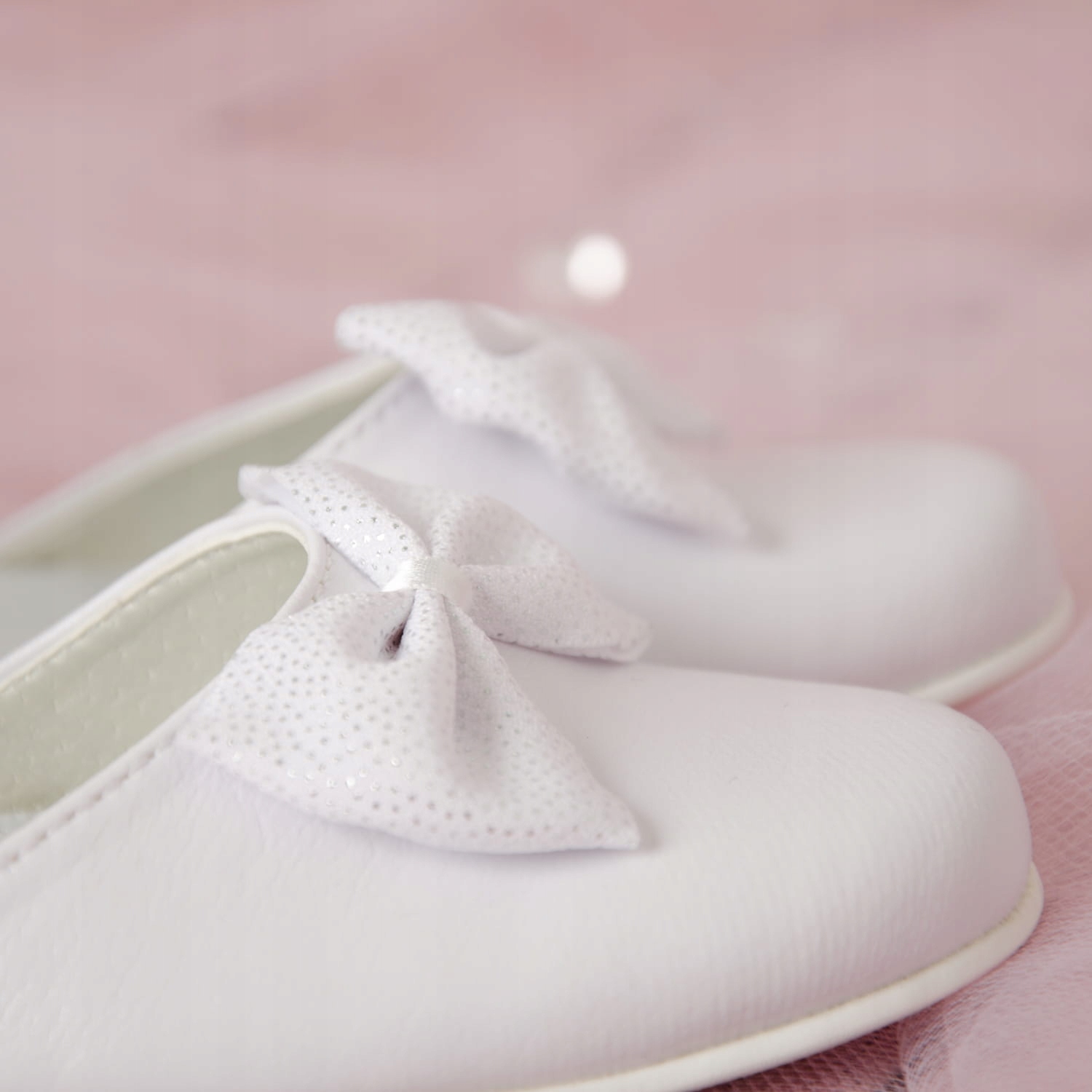 елегантне взуття для причастя для дівчини. Мода з каблуком і регульованим ремінцем. Добре -взуття, що робить їх дуже комфортними. Модель на делікатному каблуці з висотою 2,5 см, білим. Білий лук дає їм чарівність. Класична модель, яка буде відповідати більшості суконь або ALB. Зовнішня частина взуття виготовлена з екологічної шкіри, а п’ята та вставка натуральної шкіри.