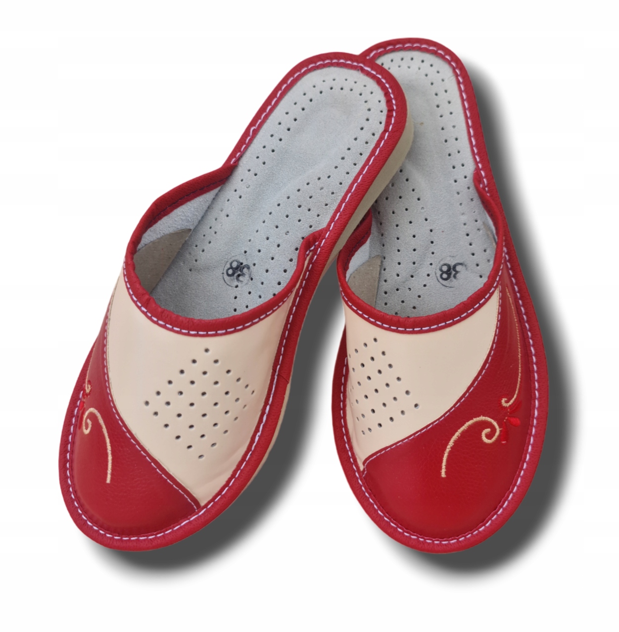 Верх виготовлений зі штучної шкіри, яка легко відмивається від забруднень. Доступний у двох колірних варіантах: бежево-червоний або бежево-коричневий. Красива вишивка додає шарму та привертає увагу