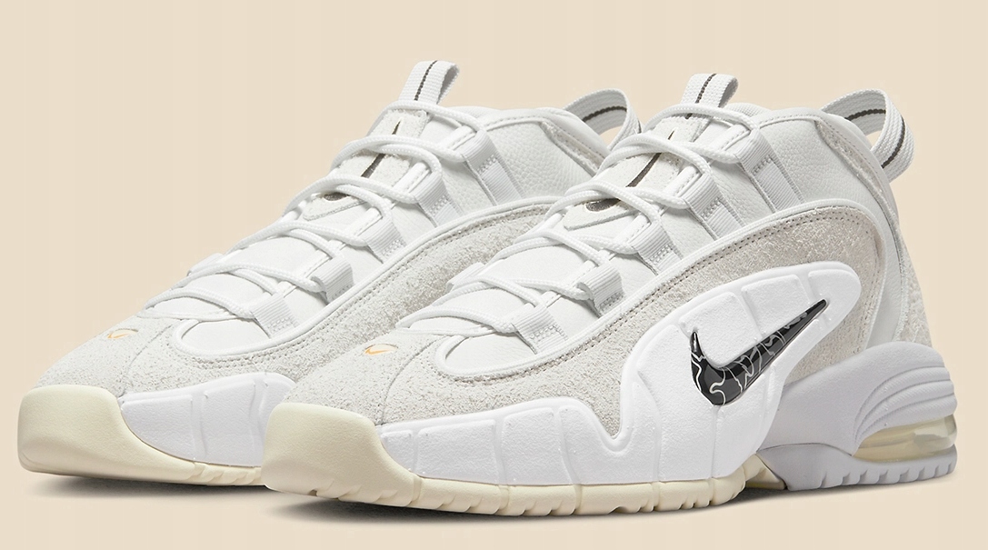 Nike Air Max Penny 1 PRM Photon Dust має верхню частину, яка поєднання світло-сірої нечіткої замші та білої зернистої шкіри. На панелі ми знаходимо чорну галочку з боків, яка відповідає фірмовим знакам, зокрема на п’яті та язику. Цей майже монохромний набір підтримується двокольоровою біло-бежевою підошвою Air-Sole.