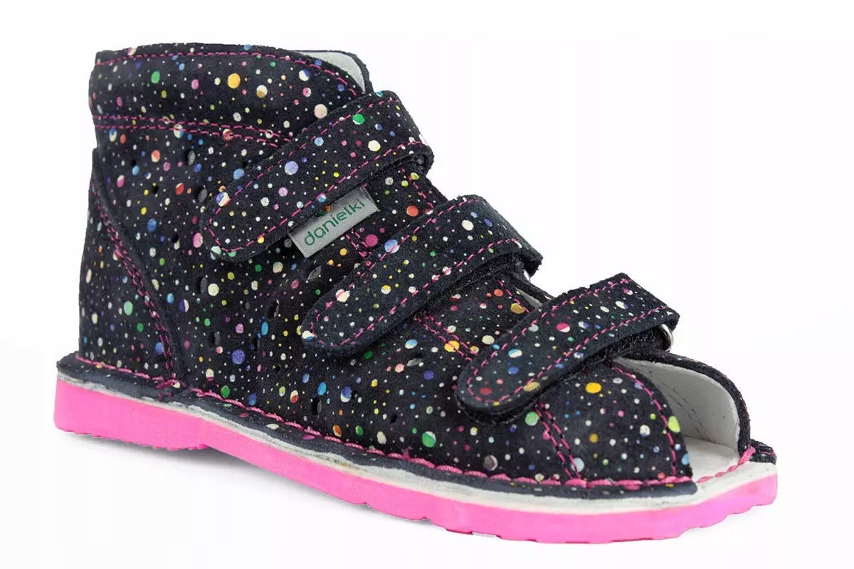 Дівчачі профілактичні босоніжки Danielki T125L з натуральної шкіри - бестселер продажів. Дуже популярна модель, оснащена посиленим каблуком і каблуком Томаса. Різнокольорові точки на верху ідеально поєднуються з рожевою підошвою.