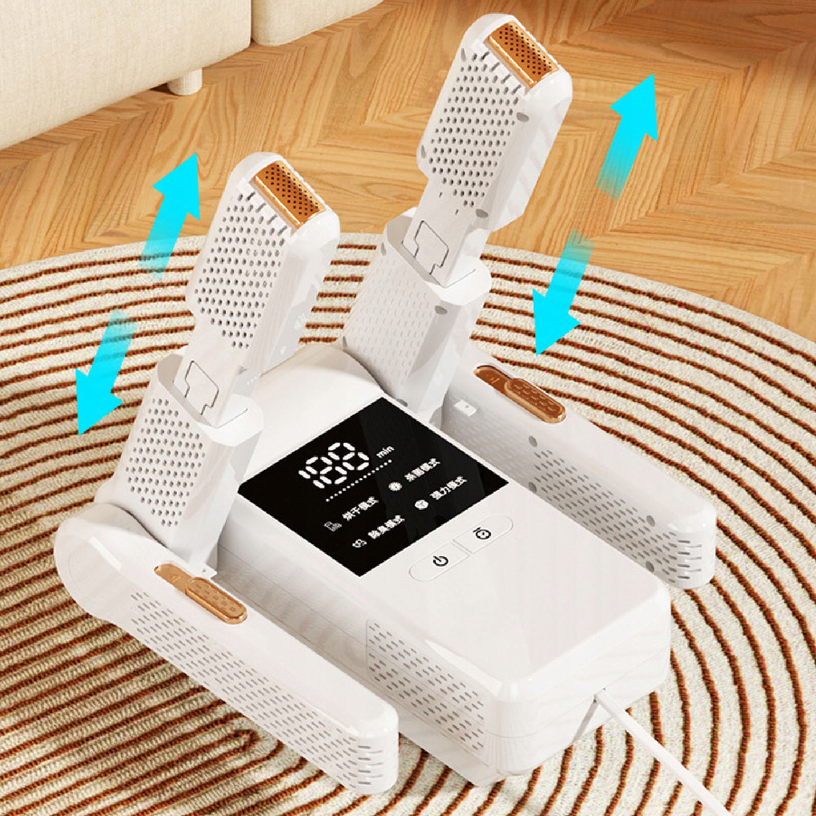 3. Багатофункціональна та елегантна конструкція таймера: Завдяки регульованій конструкції чотирьох ніг ця сушарка взуття може бути комфортною, щоб легко зберігати, коли він не використовується. Багатофункціональна команда дозволяє встановити період сушіння для задоволення ваших потреб.