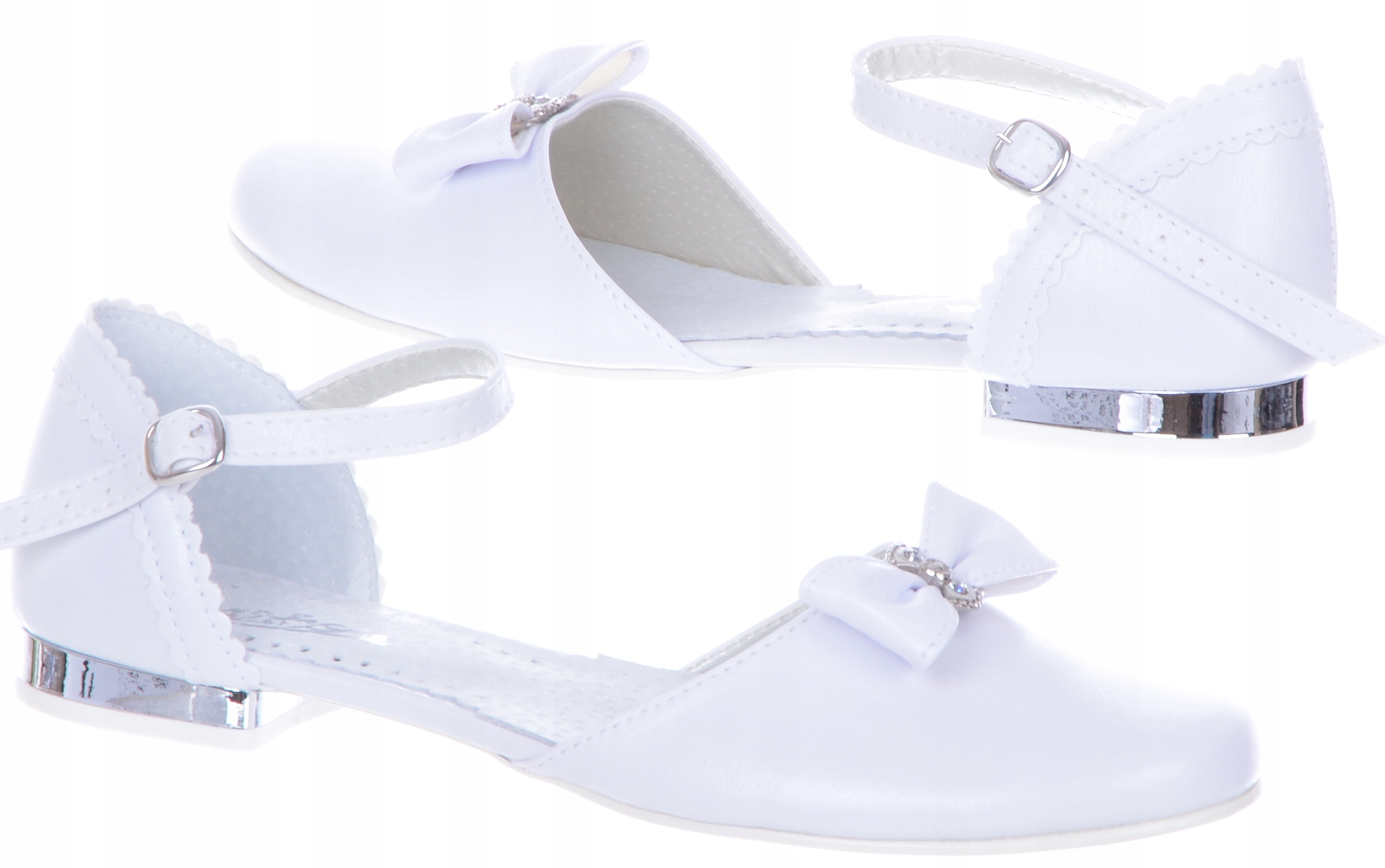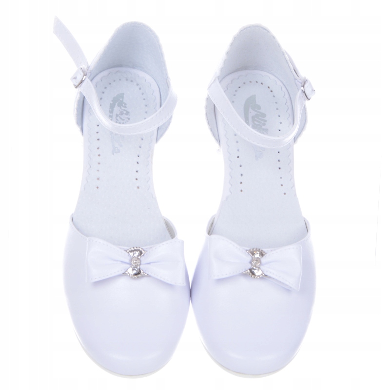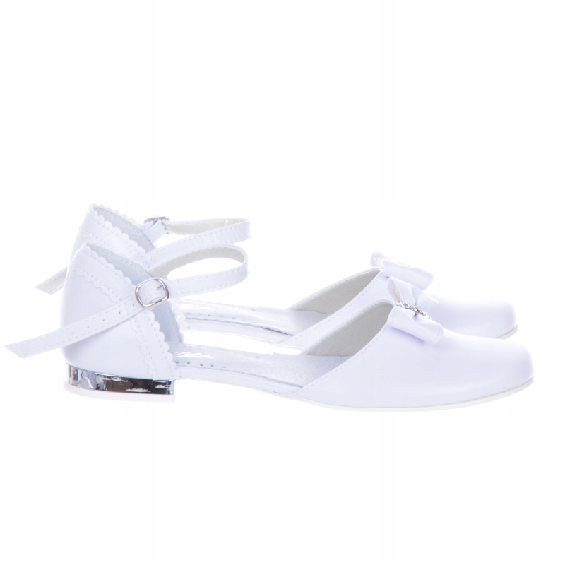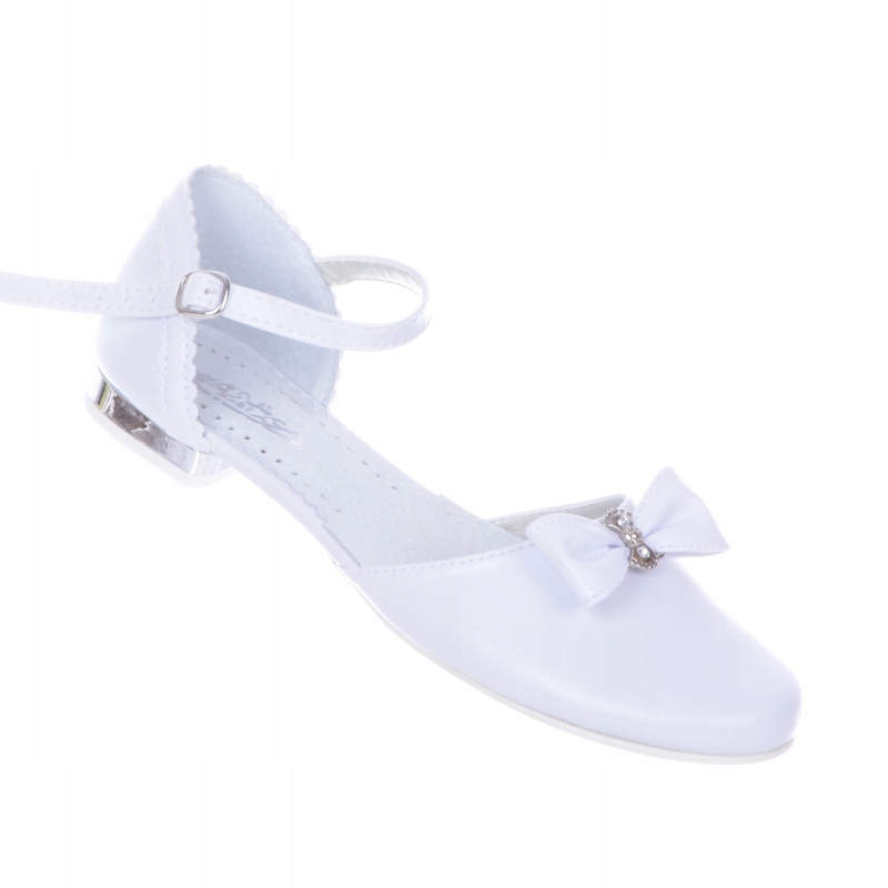 Елегантні, зручні та надзвичайно красиві туфлі для причастя. Верх виготовлений з екологічної шкіри. Взуття також має шкіряну профільовану устілку. Легкі, дуже зручні! Зроблено з увагою до деталей. Чудове поєднання білого з сріблястими аксесуарами робить цей день особливим. Мають декоративні елементи і ремінець, який утримує взуття в зручному положенні. Вони ідеально підходять для урочистих випадків. Продукт повністю виготовлений у Польщі компанією MIKO