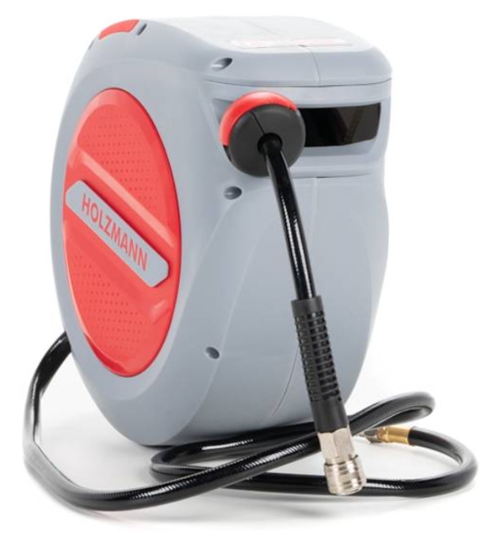 Професійний пневматичний шланг довжиною 15 м на автоматичній котушці. Шланг закінчений стандартними ніпелями.