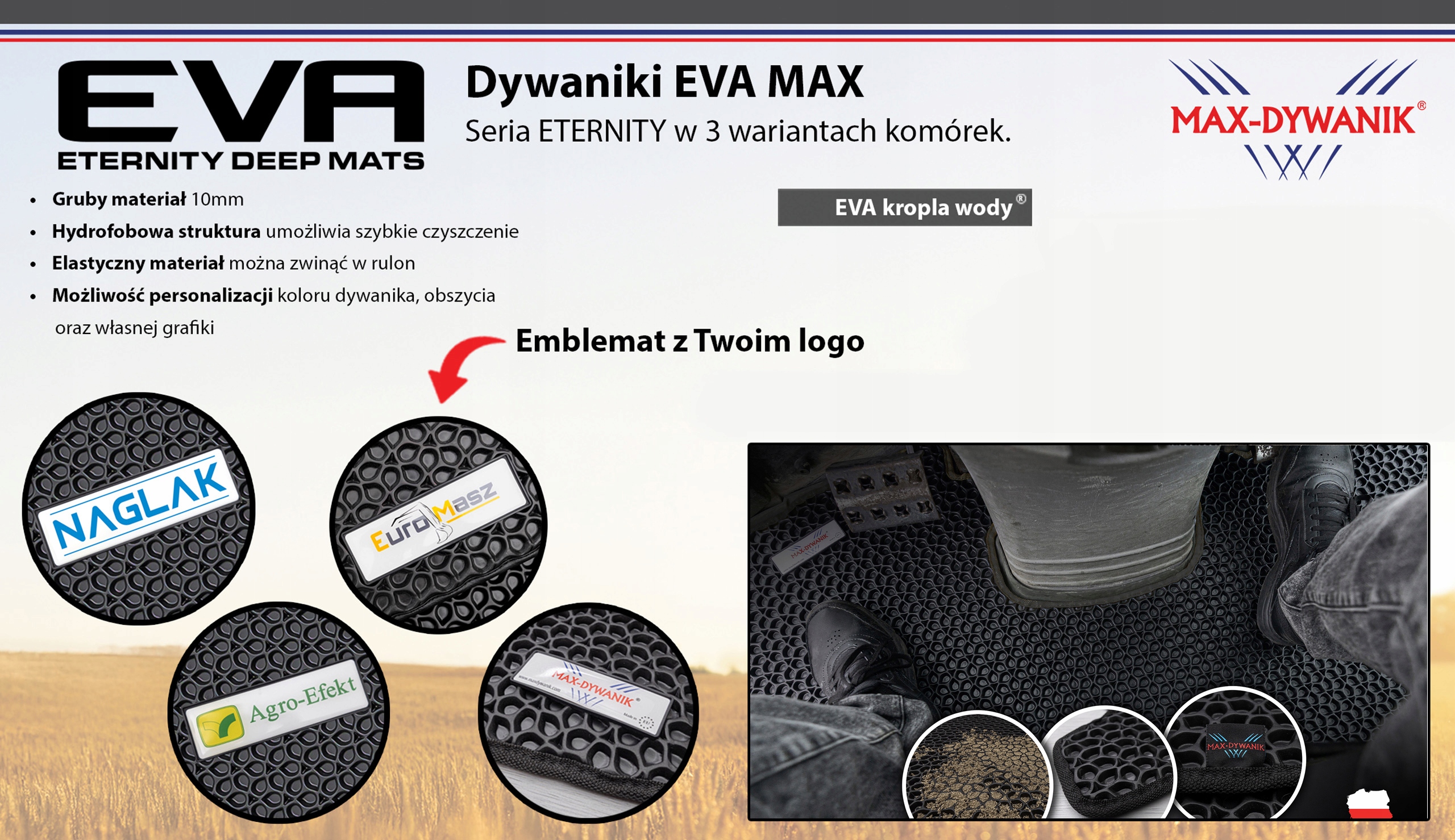 Тема пропозиції - це килим Eva Max компанії, виготовлений авторитетною польською компанією Max -Dywanik - EVA ETITICE DEEP MATS, розробленими для будівельної машини (зарядного пристрою) , розробленого в унікальній схемі у краплях води, припинення забруднення всередині клітин, забезпечуючи чистоту та замовлення. Килим оброблений естетичною чорною стрічкою, завдяки чому продукт закінчується на найвищому рівні.