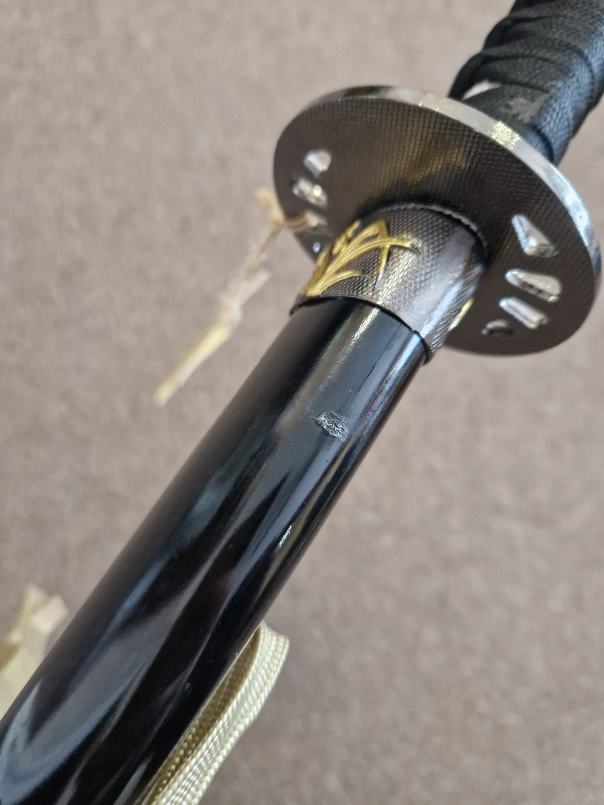 - НОЖНИ/ САЯ: Тверда деревина, розписана вручну в чорний колір, ручна різьба, чорна бавовняна оплетка на ручці, імітація шкіри ската, метал цуба.