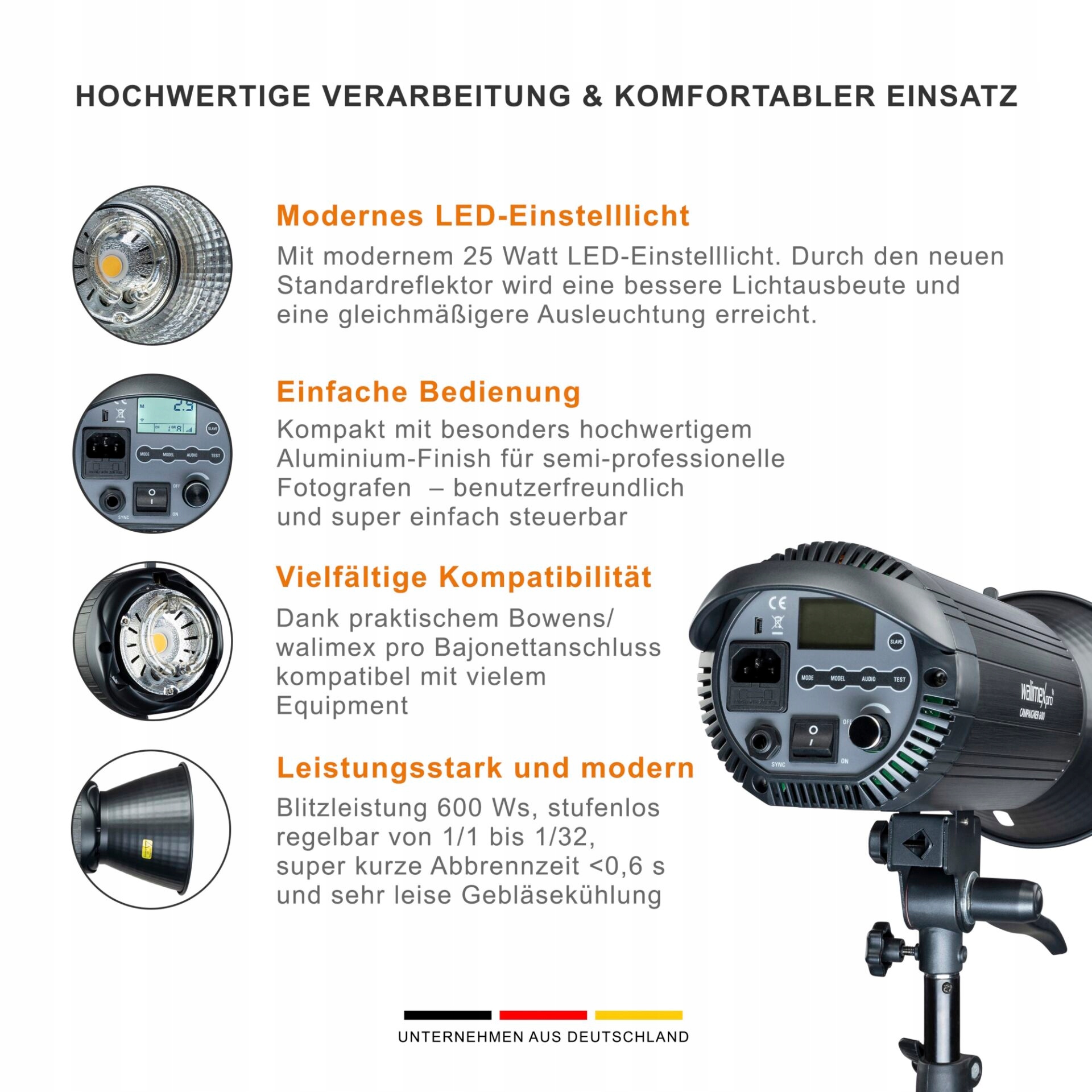 - Висока потужність спалаху: кожна лампа в наборі забезпечує потужність спалаху до 600 Вт, що забезпечує точне освітлення великих просторів.