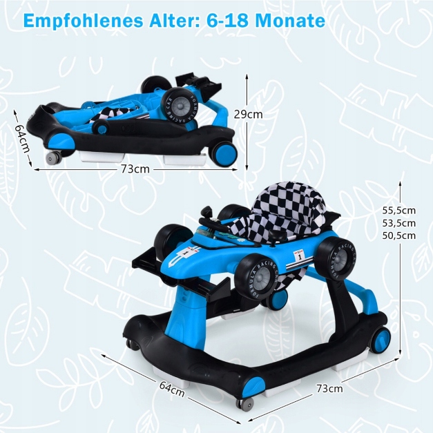 Висота та швидкість можна регулювати залежно від індивідуальних потреб малюків. Крім того, безпека -це наш найвищий пріоритет, саме тому був підголівник, а також кроки та колеса, що не мають. Сидіння вистелене м'якою піною і має ергономічну підтримку, що гарантує сидіння комфорту. Музика та світло - це додаткова забава для дітей. Після використання ви можете просто скласти ходунку.
