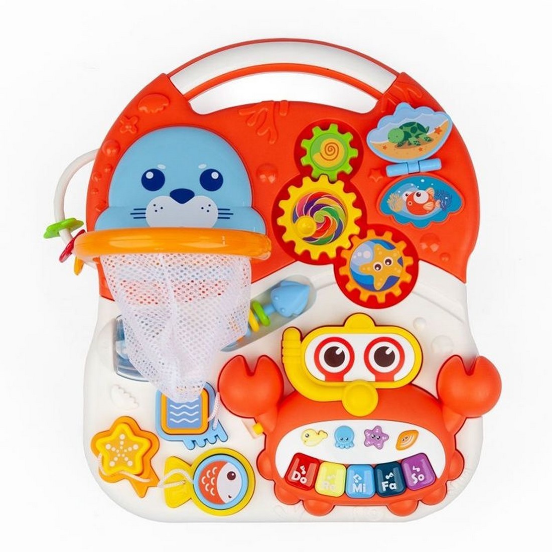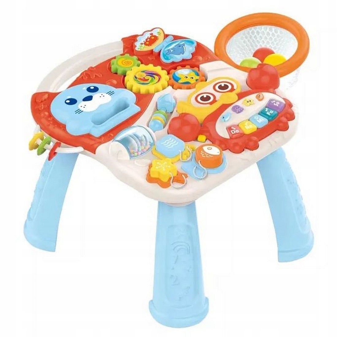 має дитяче фортепіано, барвисті передачі, сорт-сорт та багато кнопок, які активують веселі мелодії та вогні.