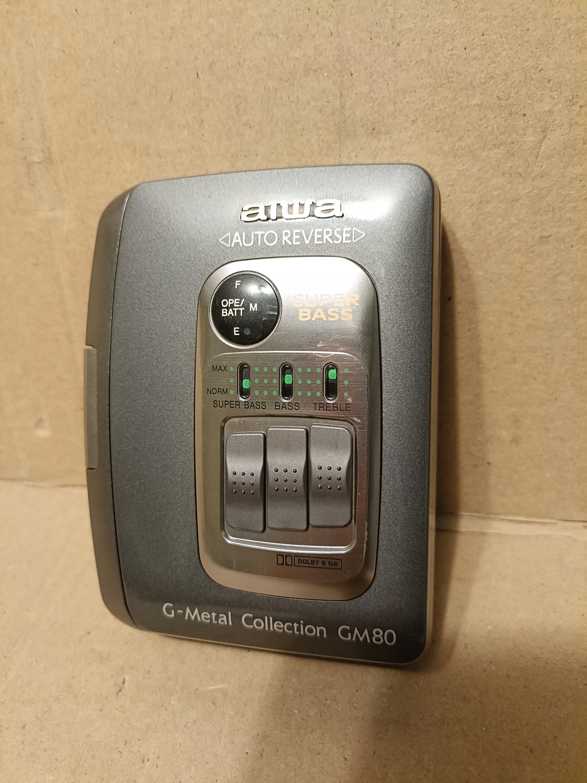 Портативний касетний програвач: AIWA HS-GM80 (після вставлення батарей ви чуєте роботу, але він не тягне котушку!).