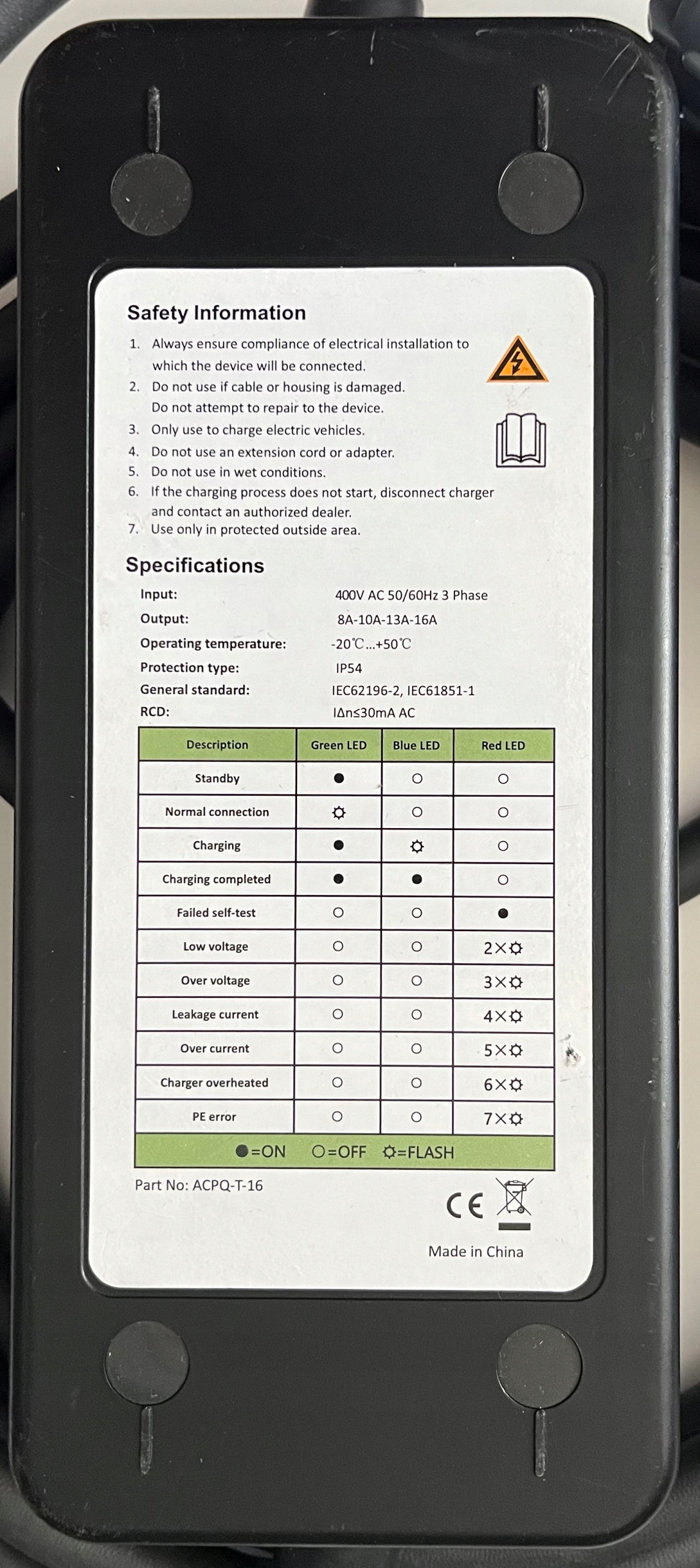 Зарядник автоматично регулює інтенсивність в діапазоні 8a, 10a, 13a та 16a. Максимальна потужність зарядки - 11 кВт , що забезпечує швидку та стабільну енергетичну добавку. Пристрій адаптує роботу до температури - у разі перегріву його зменшує потужність або припиняє зарядку, а потім відновлює його після охолодження.