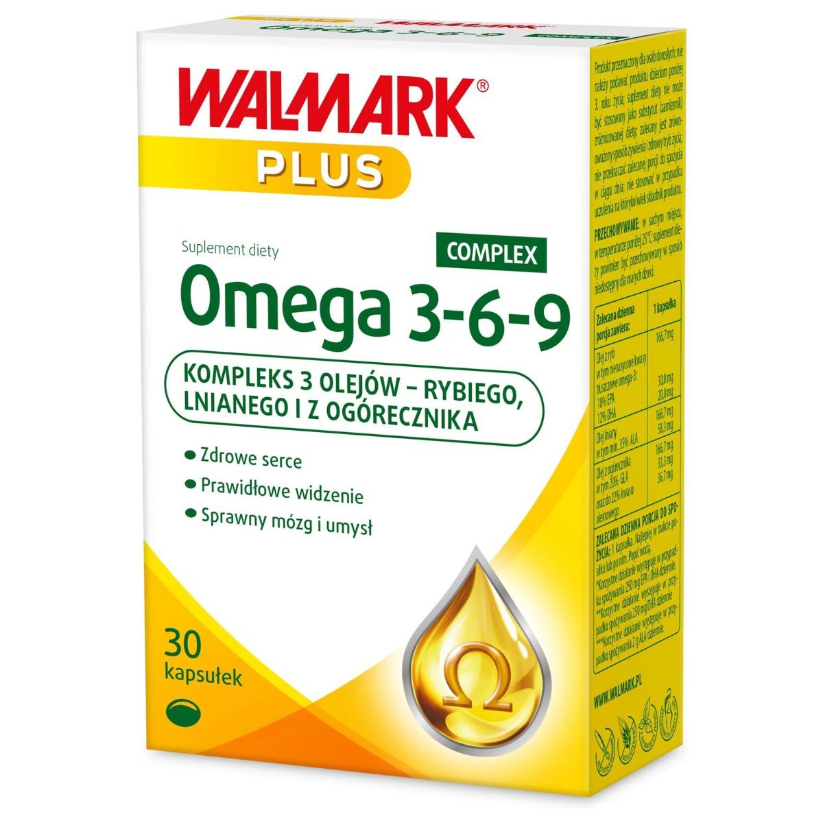 стадо Pharm Walmark Omega 3-6-9-це комплекс жирних кислот, отриманих з риб, вкладки та огіркових олій. Кожна з цих кислот-омега-3, омега-6 та омега-9 грають ключову роль у підтримці здоров'я серця, що підтримує нормальну кровообіг та регуляцію холестерину. Омега-3, що є джерелом EPA та кислоти DHA, впливає на належне функціонування мозку та здатність концентруватися, що особливо важливо для людей, що ведуть активний спосіб життя та психічно. Завдяки відповідному балансу інгредієнтів, отриманих лише з природної сировини, доповнення до цього комплексу підтримує здоров'я серцево -судинної системи та загальне функціонування тіла.