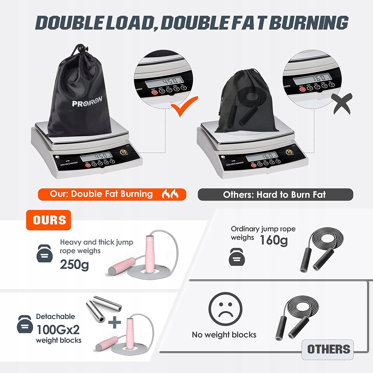 - ✅【Скакалка з обтяженими штангами】 Скакалка PROIRON для дорослих постачається з двома штангами з обтяжувачами (100 г кожна в ручці). який можна легко розібрати для адаптації до різних тренувань. Тож ви можете замінити скакалку вправами, скакалку 250 г без штанги для початківців, скакалку 450 г для просунутих тренувань (важка скакалка та штанга з обтяженнями)