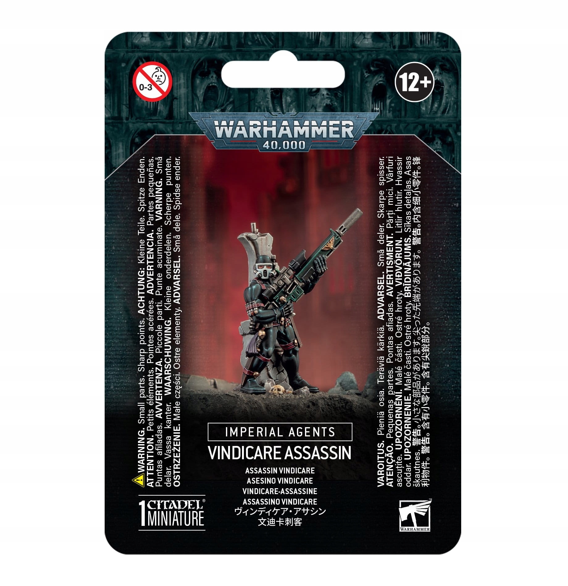 Цей багатокомпонентний пластиковий набір створює Vindicare Assassin, орлиноокого імперського агента, спрямованого, щоб відбивати ворогів Імперія. Одягнений у стелс-костюм і шпигунську маску, Vindicare — це терплячий вбивця, озброєний екзитусною гвинтівкою та пістолетом, а також бойовим клинком і набором спеціальних патронів, прив’язаних до їхніх кінцівок. Вони можуть вразити навіть найсильніші цілі на відстані, ще до того, як ворог навіть дізнається, що їх вдарило.
