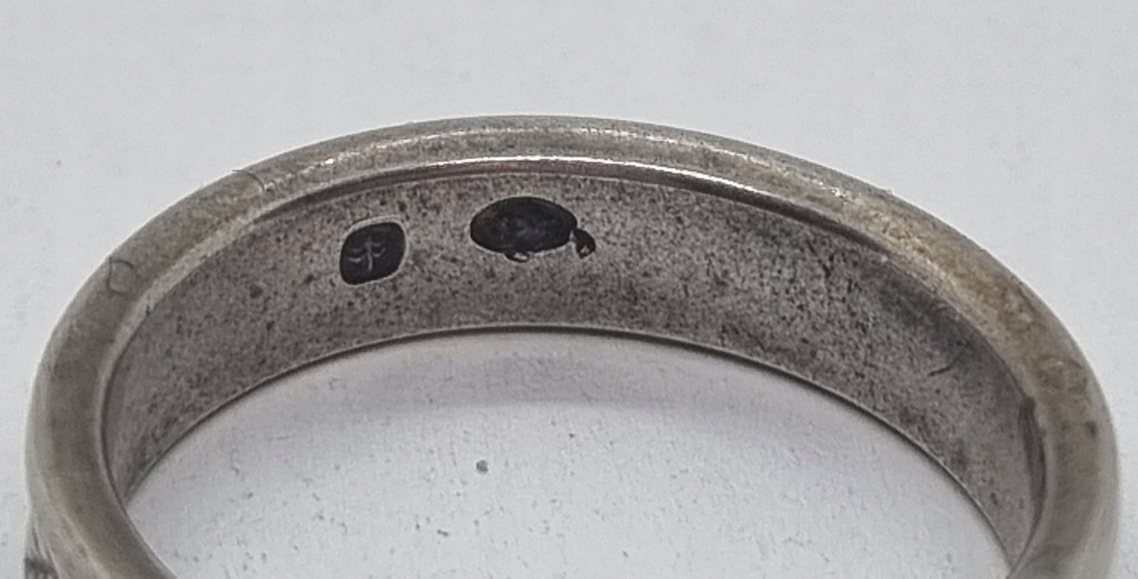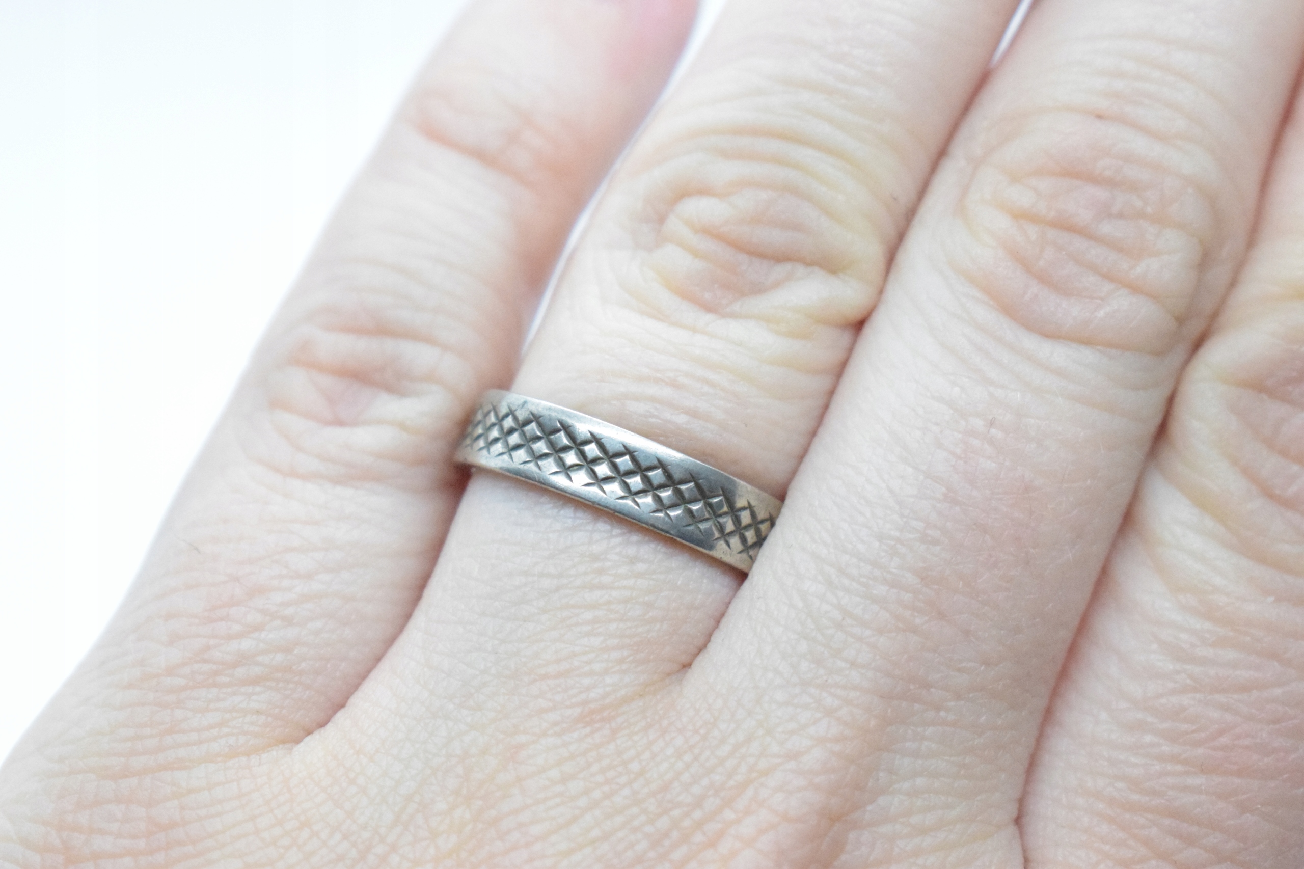Обручка має характерний відбиток/клеймо виробника "очерет" на внутрішній стороні та польське срібне клеймо "В голові жінки 3", яке використовувалося в 1963 - 1986 роках.