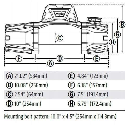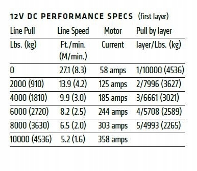 Модель VR EVO 12-S Двигун 12 В постійного струму, послідовний (послідовний намотування) Максимальна тяга 5443 кг Контроль дистанційне керування, підключення 2 в 1 - можливість керування бездротовим способом або за допомогою кабелю 3,5 м (11,5') Коефіцієнт 234:1 Спорядження 3-ступінчастий, планетарний Клатч з обертовим кільцем (вільний намотування) Посібник розсувні Гальмо весна Розміри барабана довжина 23 см, діаметр 6,73 см Мотузка синтетичний - довжина 27,4 м, діаметр 9,5 мм Рекомендований акумулятор 650 CCA (мінімум) Завершення грунтовка з порошковим покриттям Вага 32,8 кг Герметичність IP68 Гарантія термін служби - обмежений - для механічних елементів, і 7 років - для електричних елементів