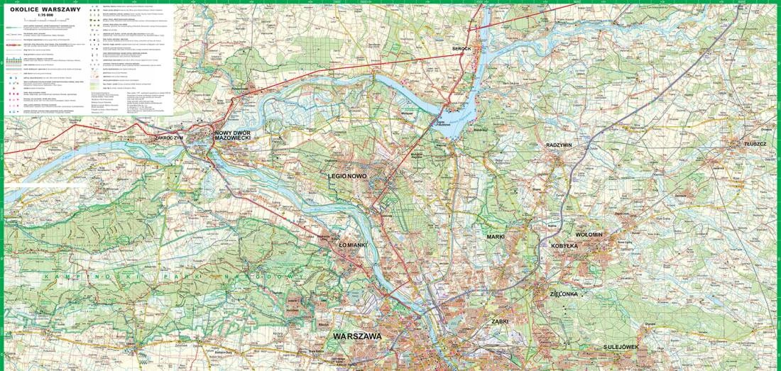 Двостороння ламінована туристична карта Варшави, яку легко скласти, охоплює територію від Сероцька на півночі до Тлуща й Колбеля на сході, Гури Кальварії й Мщонова на півдні, а також Тересіна й Кампіноса на сході. захід. Видання підготовлено у співпраці з досвідченими туристами регіону.