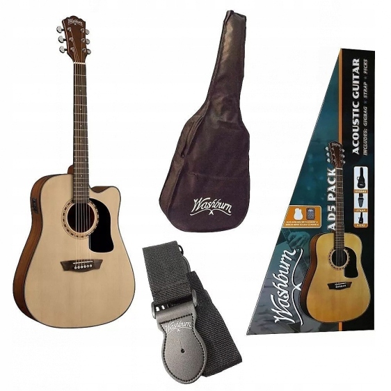 Набір, що містить електроакустичну гітару Washburn Ad 5 CE та аксесуари: кришки, ремінь та кубики гітари. Специфікація приладу: Електроакустична гітара з учнівської серії, форма Dreadnounge з різанням (вирізання). Верхня тарілка: ялина. Сторони і назад: червоне дерево. GRYF: Mahogany, двосторонній регулюючий стрижень. Санування: Деревина з двигуном. Кількість порогів: 20. Сідло: пластик, ширина: 1 11/16 ". Міст: Деревина з двигуном. Мензура: 25 1/2". Клавіші: Diecast Chrome. Активна електроніка Barcus Berry LX4 з хроматичним тюнером. Колір: природний. Оздоблення: Високий блиск.