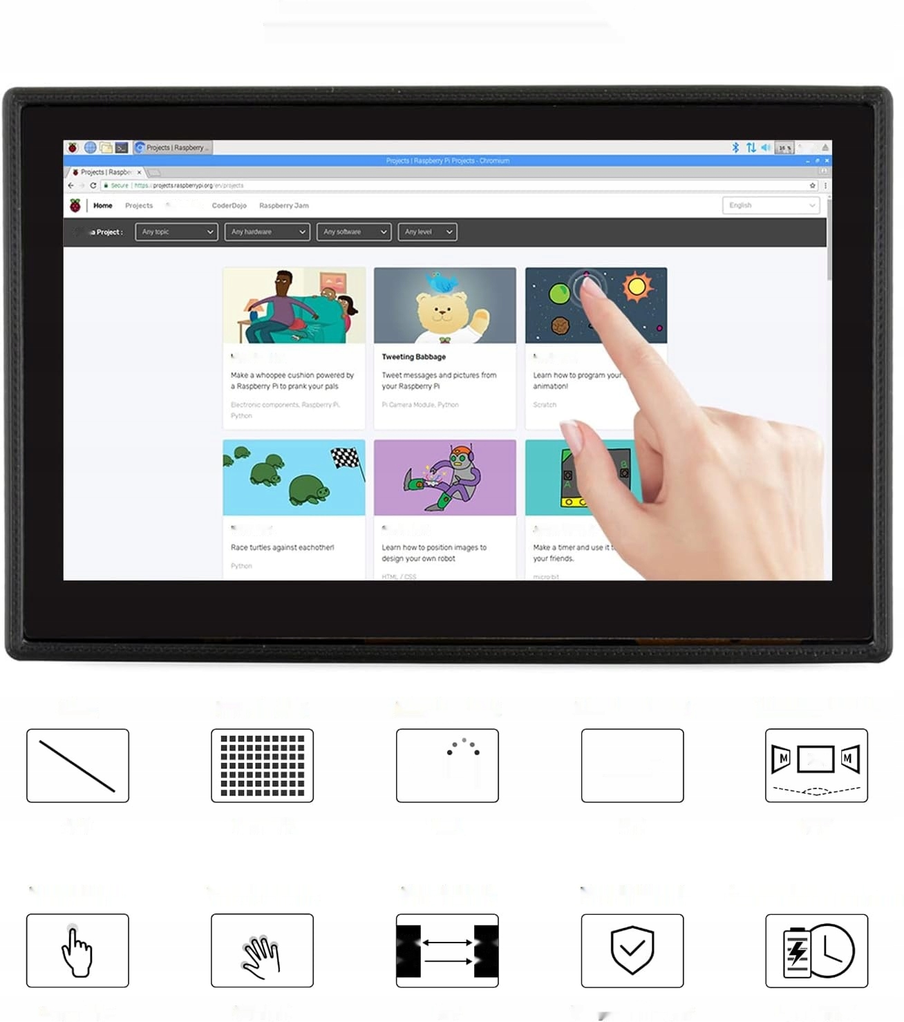 Інтерфейс MIPI DSI та частота оновлення до 60 Гц забезпечують безперебійну роботу. Підтримка 5-точкового дотику в Raspbian і одноточкового дотику в Ubuntu, Kali, WIN10 IoT надає різноманітні функції. Крім того, екран підтримує ретро-стиль без необхідності встановлення додаткових драйверів.