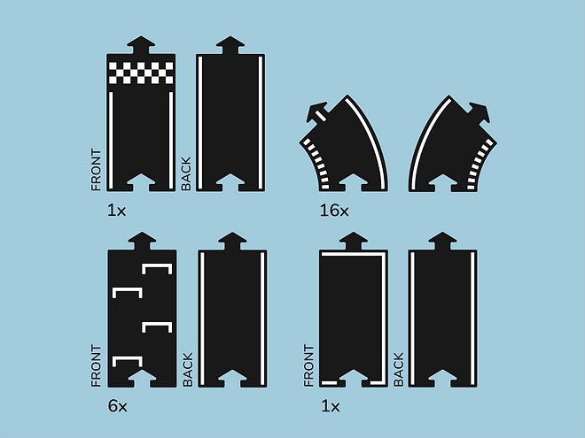 Дорожня головоломка є гнучкими елементами, мають пофарбовані сосни, смуги руху, паркінг, старт і фініш. Елементи, які легко з’єднуються, дозволять вам побудувати дорогу за власною уявою, а численні комбінації композицій подарують масу задоволення та зовсім не занудьгують.