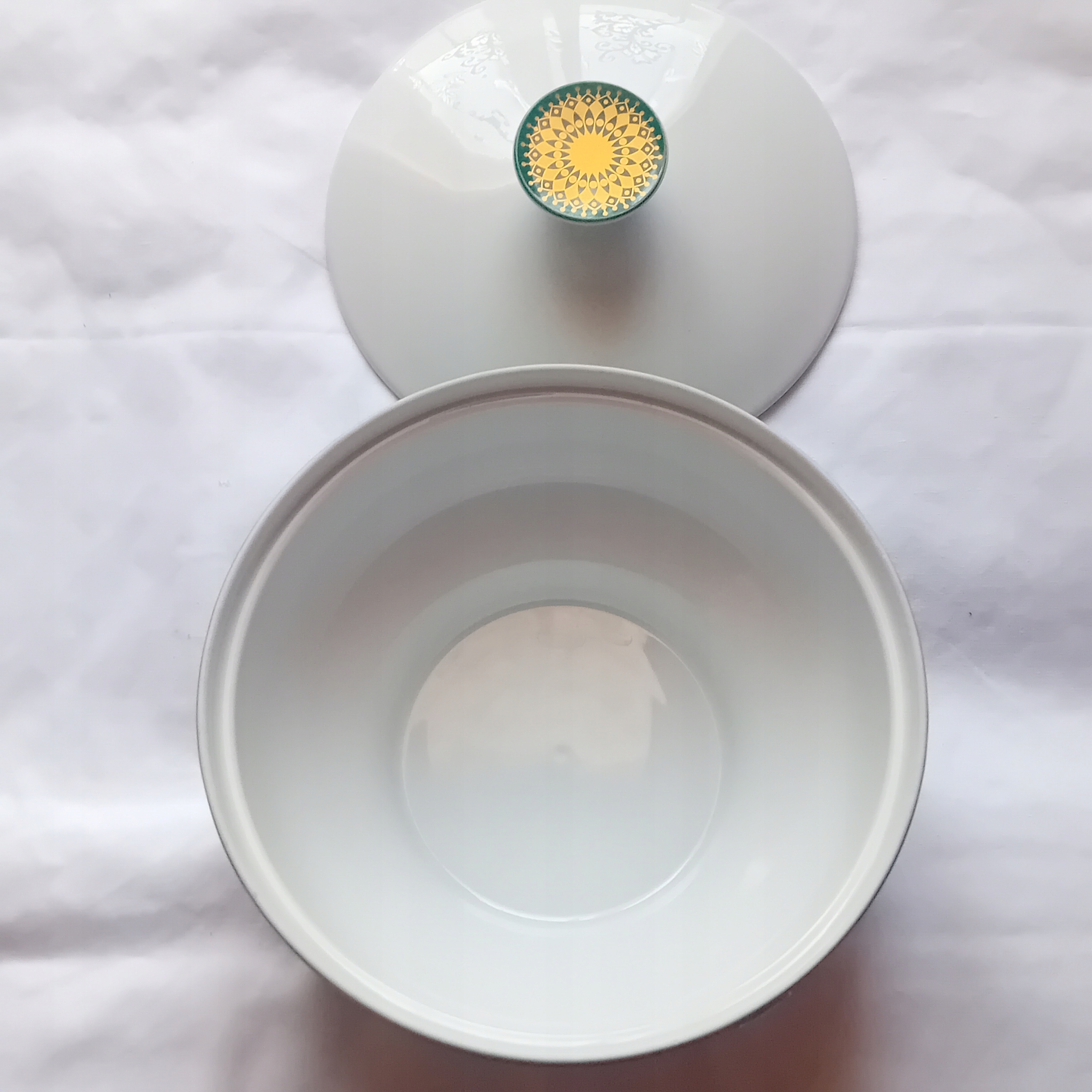 Продам вазу виробництва Thomas - Rosenthal Group, марка 1959-77 років. Висота 9 см. , з кришкою 12,5 см. Діаметр 20 см. Ваза в біло-зеленому кольорі, з позолотою на боковинах і ручці. На жаль, вона пошкоджена – відсутні обидві ручки. Місця їхнього загону видно на фото. Крім цього, інших пошкоджень немає. Можливо комусь стане в нагоді, наприклад, як кришка для квіткового горщика.