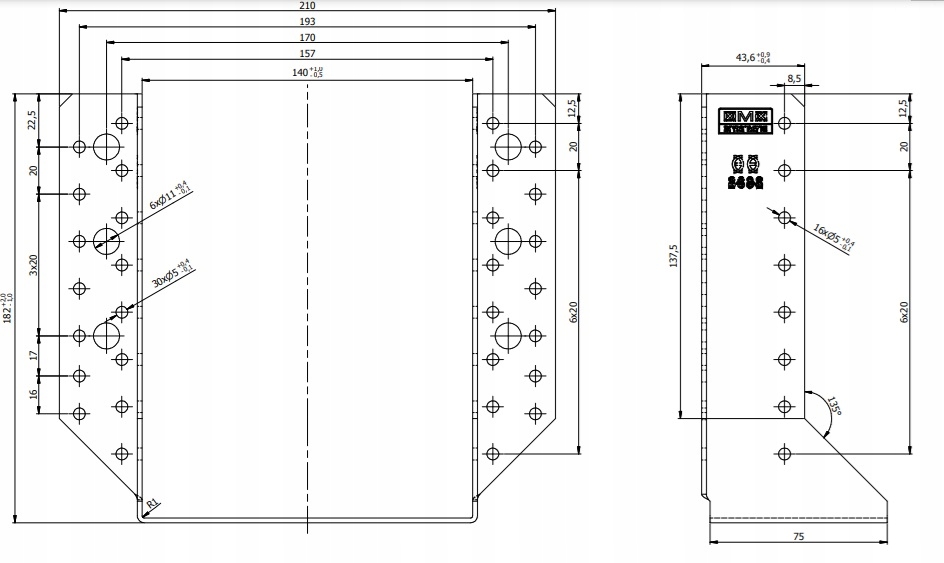 отвори: ø5 x 46 шт., ø11 x 6 шт. b>