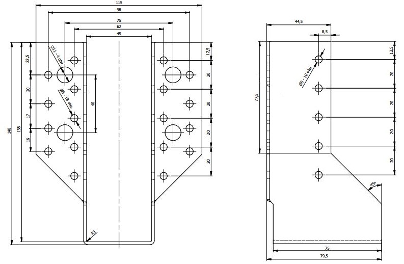 - кількість отворів - 22 отвори ø5 мм, 2 отвори ø11 мм