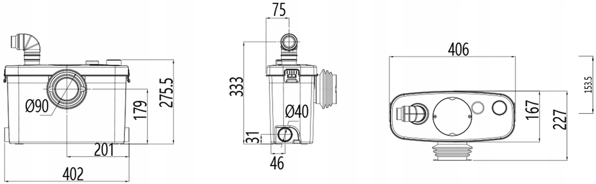 - Перевагою насоса є можливість підключення вхідного з обох боків. Мінімальна висота під’єднаного душового піддону або ванни – 15 см (в інших моделях – 25 см).