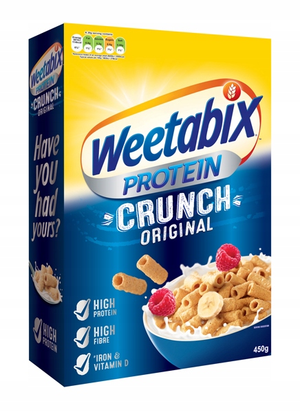 Окрема роль за столом для сніданку. Weetabix Protein Crunch ідеально підходить для тих, хто приділяє увагу багатій білками дієті. Хрусткі мультизернові трубочки містять низький вміст солі та жиру та є багатим джерелом білка та клітковини, заліза та вітамінів. З молоком або йогуртом ці пластівці забезпечують організм необхідним зарядом енергії для енергоємного початку дня.