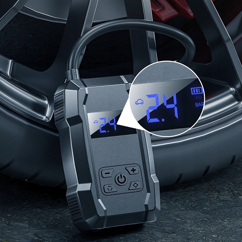 Жовійний корпус має розмір мобільного телефону, завдяки якому не займає багато місця. Пристрій оснащений кнопками дисплея та управління, які керують процесом перекачування. На дисплеї відображається поточний тиск у шинах, а за допомогою кнопок ви можете збільшити або зменшити. Багатофункціональний набір інструментів містить форсунки для перекачування кульок, велосипедів та мотоциклів.