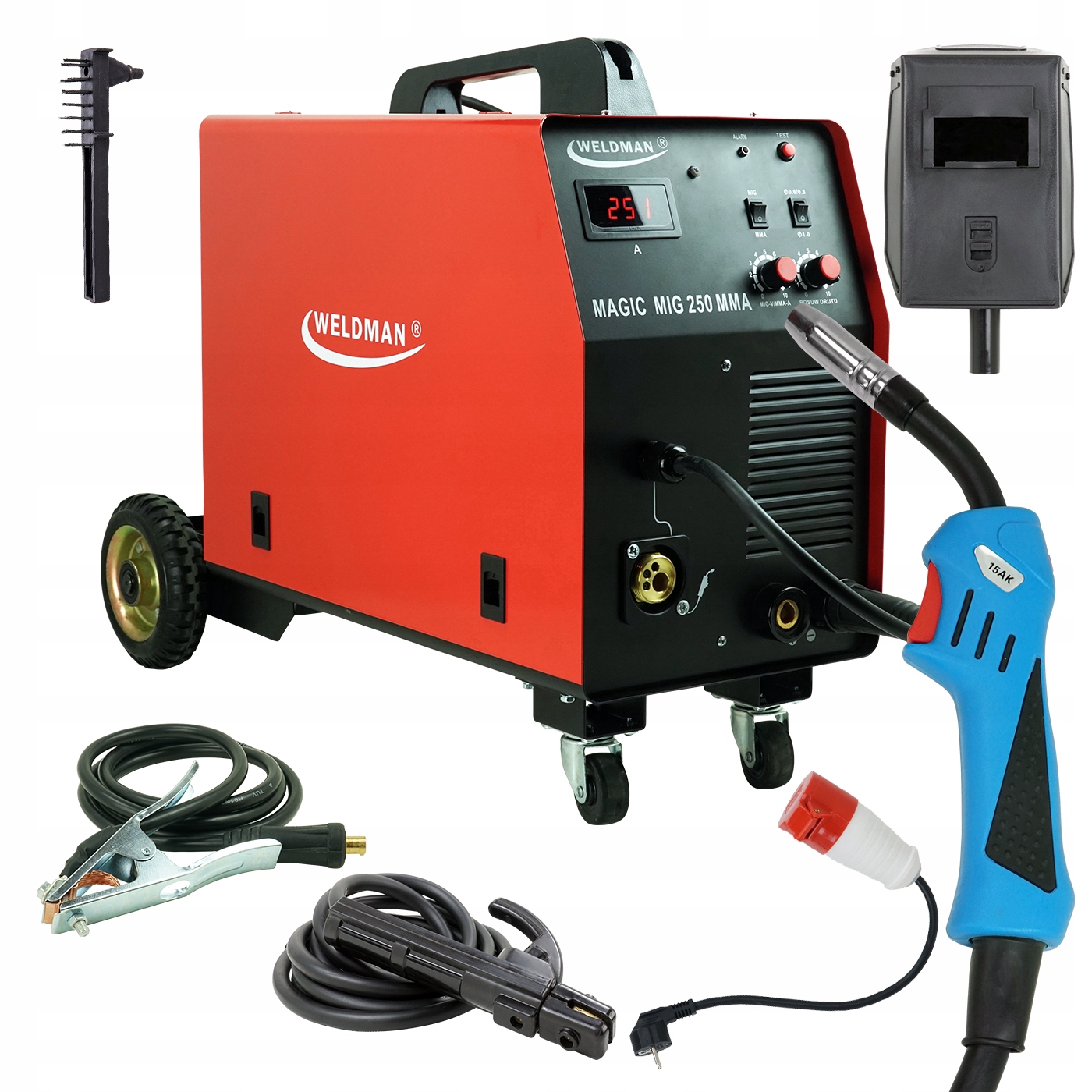 Weldman MAGIC MIG 250 — ідеальний апарат для зварювання як професійним, так і хобі. Він виготовлений за сучасною інверторною технологією IGBT. Дозволяє використовувати методи зварювання MIG/MAG (в захисному газі), FLUX (без захисного газу) та електродне зварювання. > загорнутий у ММА. Унікальний напівавтоматичний зварювальний апарат із функціональними перевагами, нечуваними в інших апаратах.