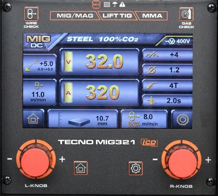 tecno mig 321 synergic lcd -це інверторне синергічне зварювання напівавтоматичне зварювання для зварювання дуги за допомогою mig/mag, флюс, mma та tig lift. Пристрій розроблений для використання у професійному та промисловому використанні. Синергічні режими зварювання: mig stal co 2 100%, mig stal co 2 25%, mif argra argon 100%, mif cusi argon 100%, Mif Steel Argon 98% + Co 2 2%