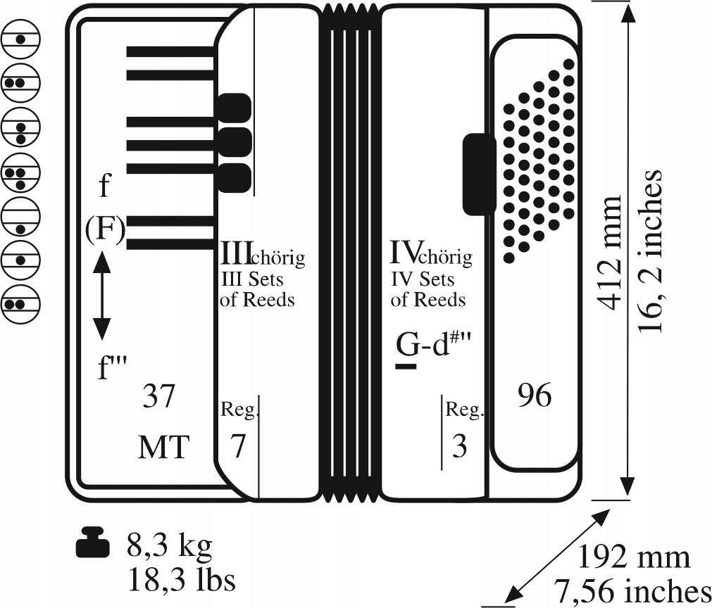 Weltmeister OPAL MT -96 Клавішний акордеон з меншими клавішами клавішами 18 мм! випускається в 7 кольорах НОВИЙ АКОРДЕОН, ТЕРМІН ДОСТАВКИ 15 РОБОЧИХ ДНІВ. вибір із або без MUSETTE Специфікація: Права рука: 37 клавіш Гамма: f - f3Регістр: 7Ліва рука: 96 басових кнопок Регістр: 3Хор: 3Розміри : 412 x 192 мм Вага: 8,3 кг Обладнання: футляр Виробник: Німеччина