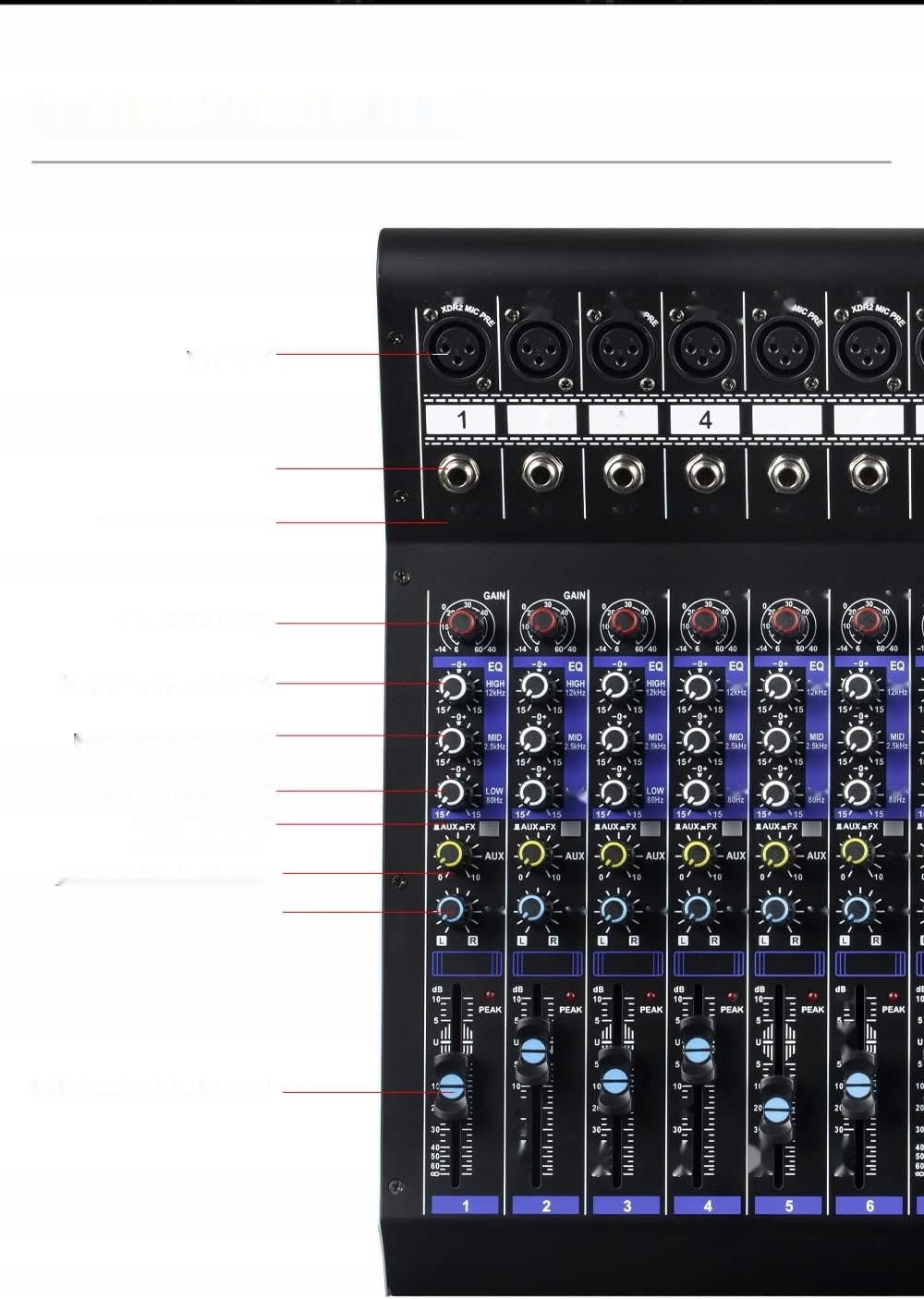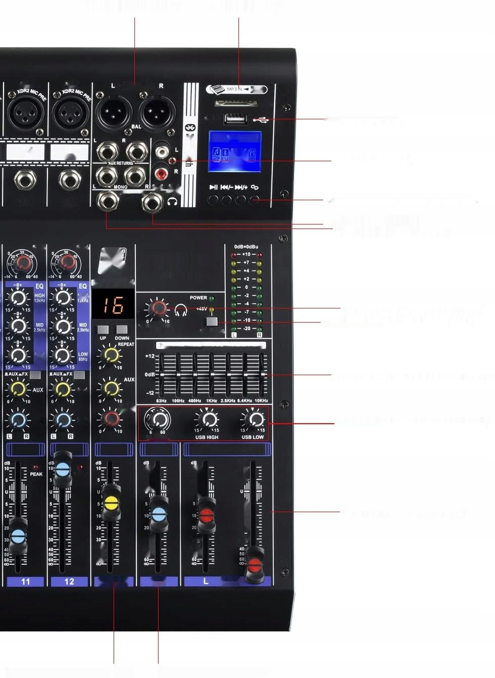 багатофункціональний аудіо змішувач з 12 каналами, ідеально підходить для різних додатків, таких як записи, ді -джей, виступи караоке та конференції.
