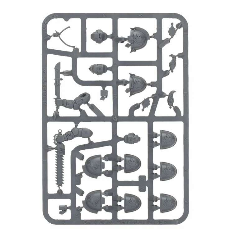 - 5 Primaris Reivers (5 мініатюр, кожна з яких постачається з 32-міліметровою круглою основою Цитаделі. Натомість їх можна зібрати як Гончі Моркаї.)
