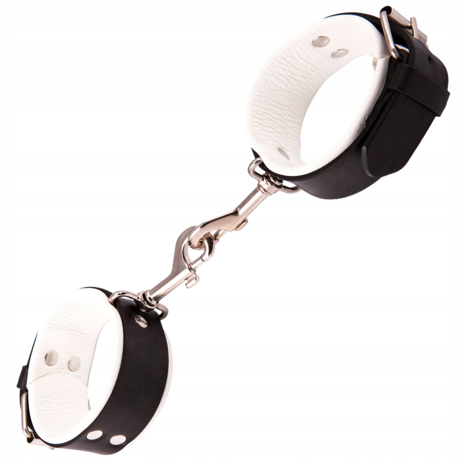 Чорно-білі шкіряні наручники застібаються на масивні пряжки. Розмір регулюється.