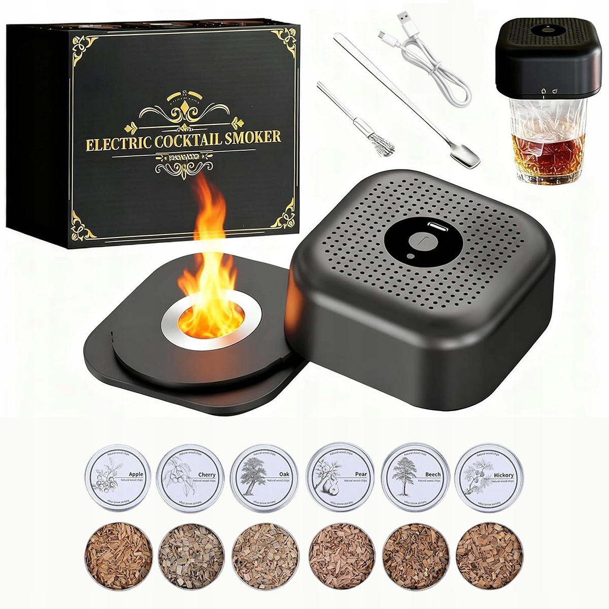 Наш набір має електричний дизайн. Він простий у використанні та усуває складні дії вручну. Електричний компонент дозволяє точно контролювати об’єм диму та час копчення, забезпечуючи незмінні результати незалежно від того, використовуєте ви його для віскі чи коктейлів.