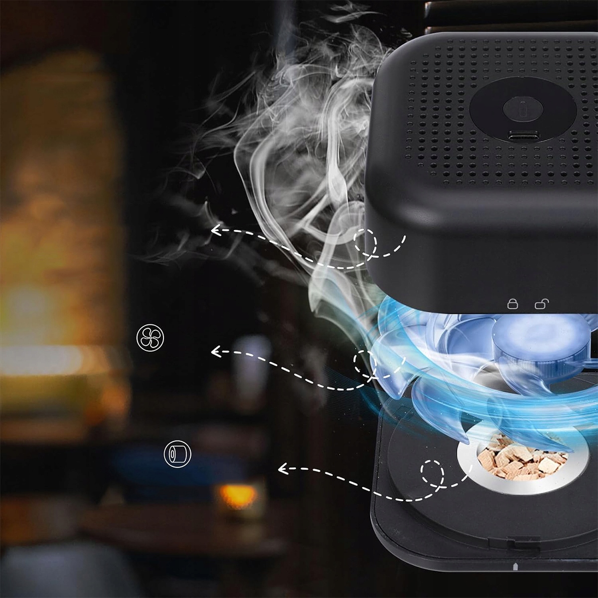 ✔️Дозволяє налаштувати аромат диму за допомогою різноманітних деревних трісок, таких як яблуко, вишня та дуб, збагачуючи смакові відчуття та підвищуючи насолоду пити.