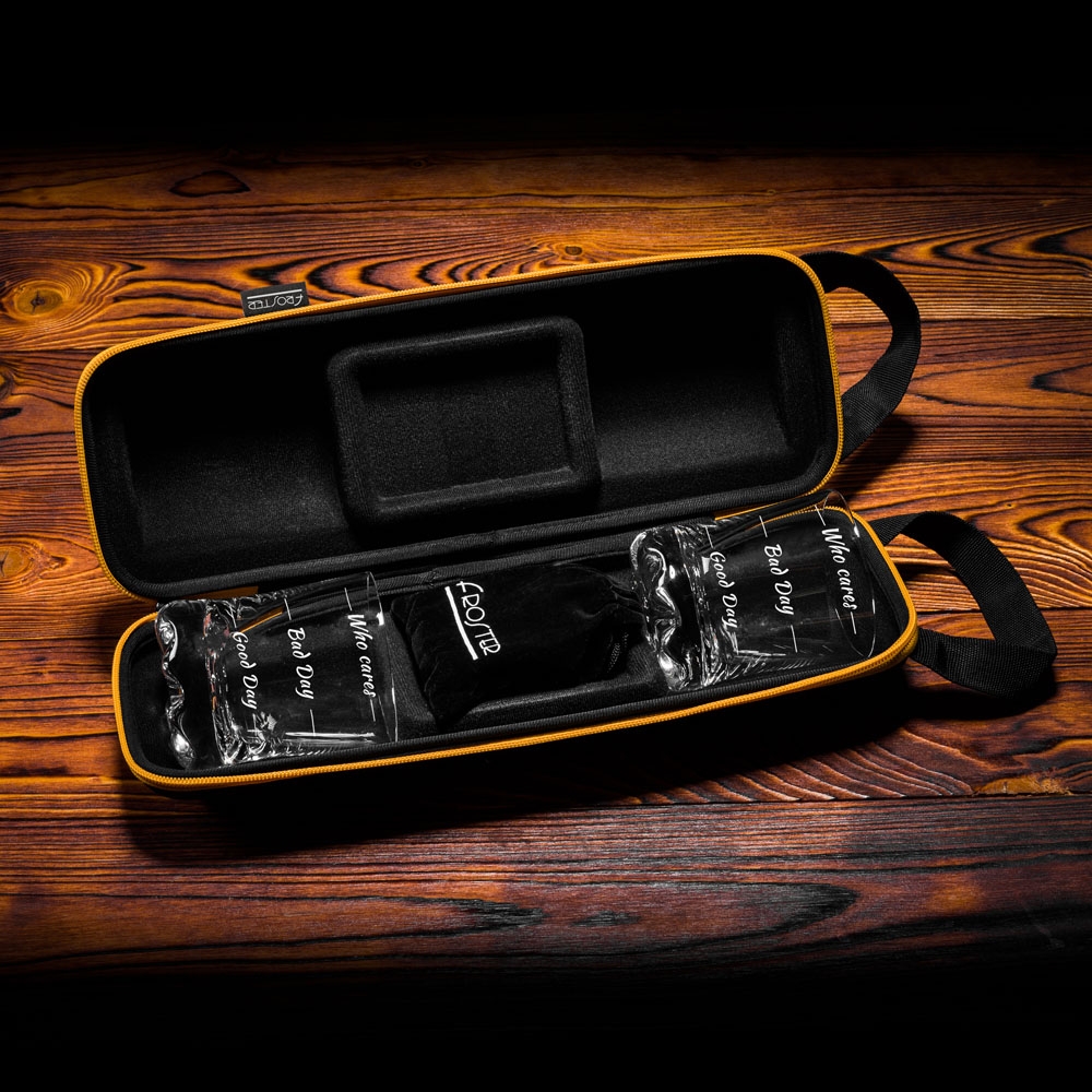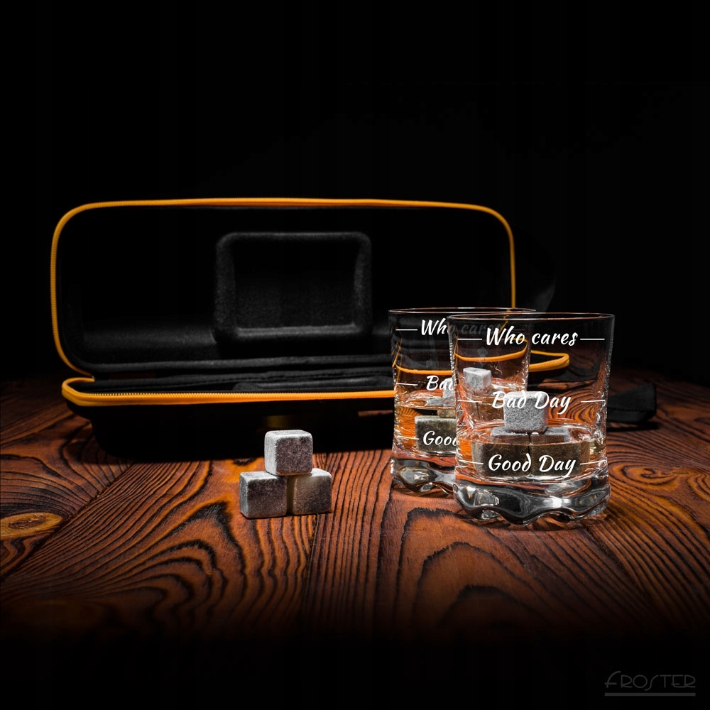 У наборі два келихи для віскі з написами, які скажуть багато про ваш настрій. У набір також входять кам'яні кубики, які охолодять напій, не розводячи його і не змінюючи смаку. Все це поміщено в елегантний міцний корпус, який захищає скло від пошкоджень. Ви можете взяти запакований набір, куди забажаєте!
