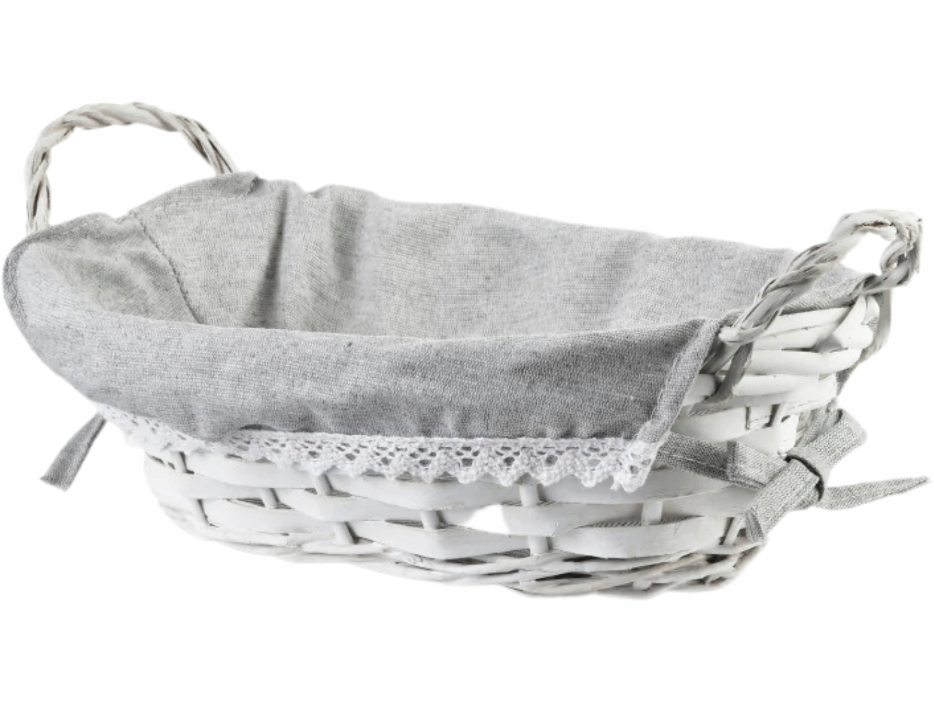 - Білий плетений кошик, обшитий сірою тканиною