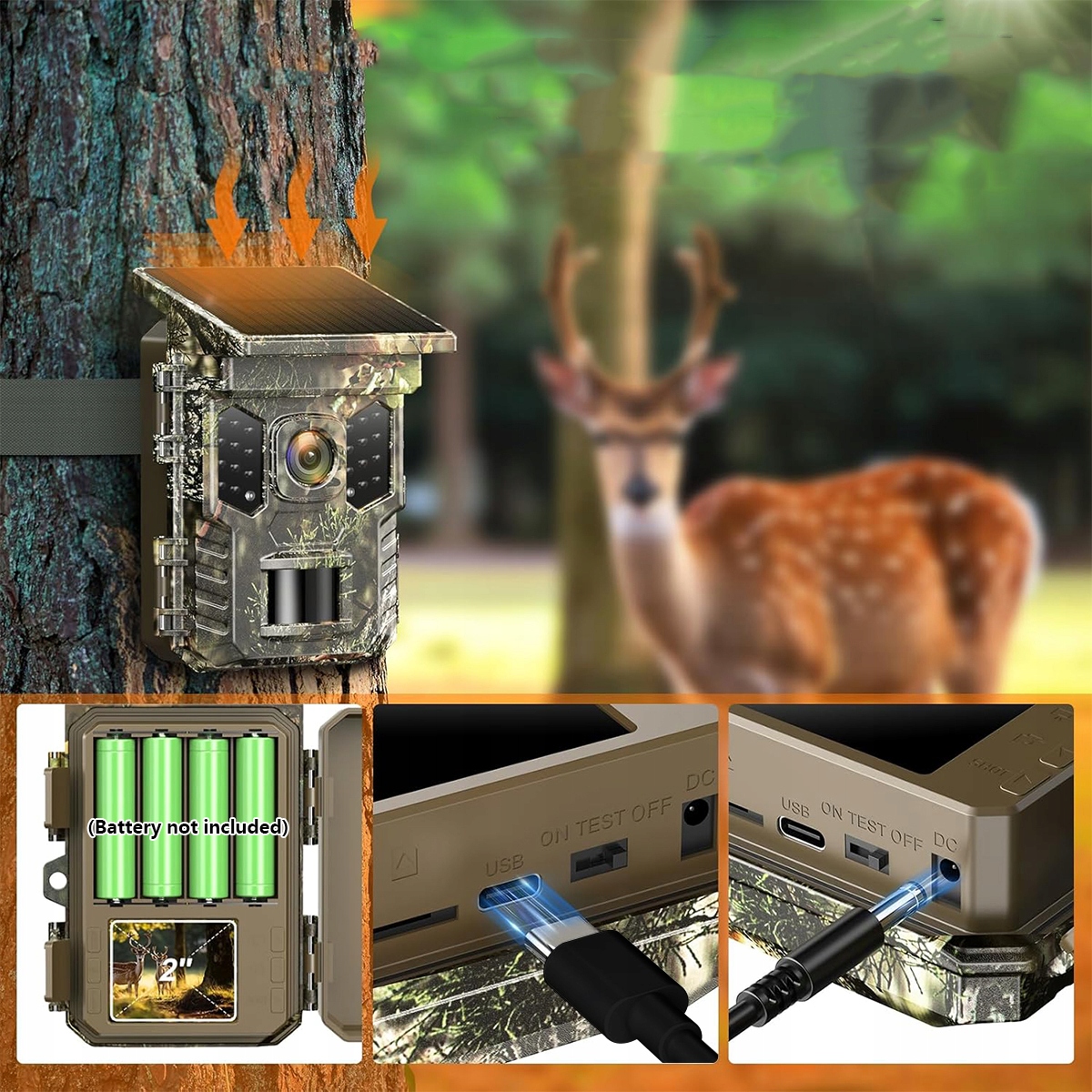 ✅ Сонячна живлення: Ця камера для фотографій дикої природи, що живиться від сонячної енергії та оснащена додатком передачі даних з мобільного телефону, має вбудований літій -акумулятор, що є потужністю 2600 мАг, яка може працювати від сонячної панелі, встановленої вгорі. Завдяки цьому споживання акумулятора AA зменшується, а навколишнє середовище захищено. Додатковий джерело живлення AA 4X забезпечує друге джерело живлення, яке продовжує час роботи акумулятора (акумулятори AA не включені).