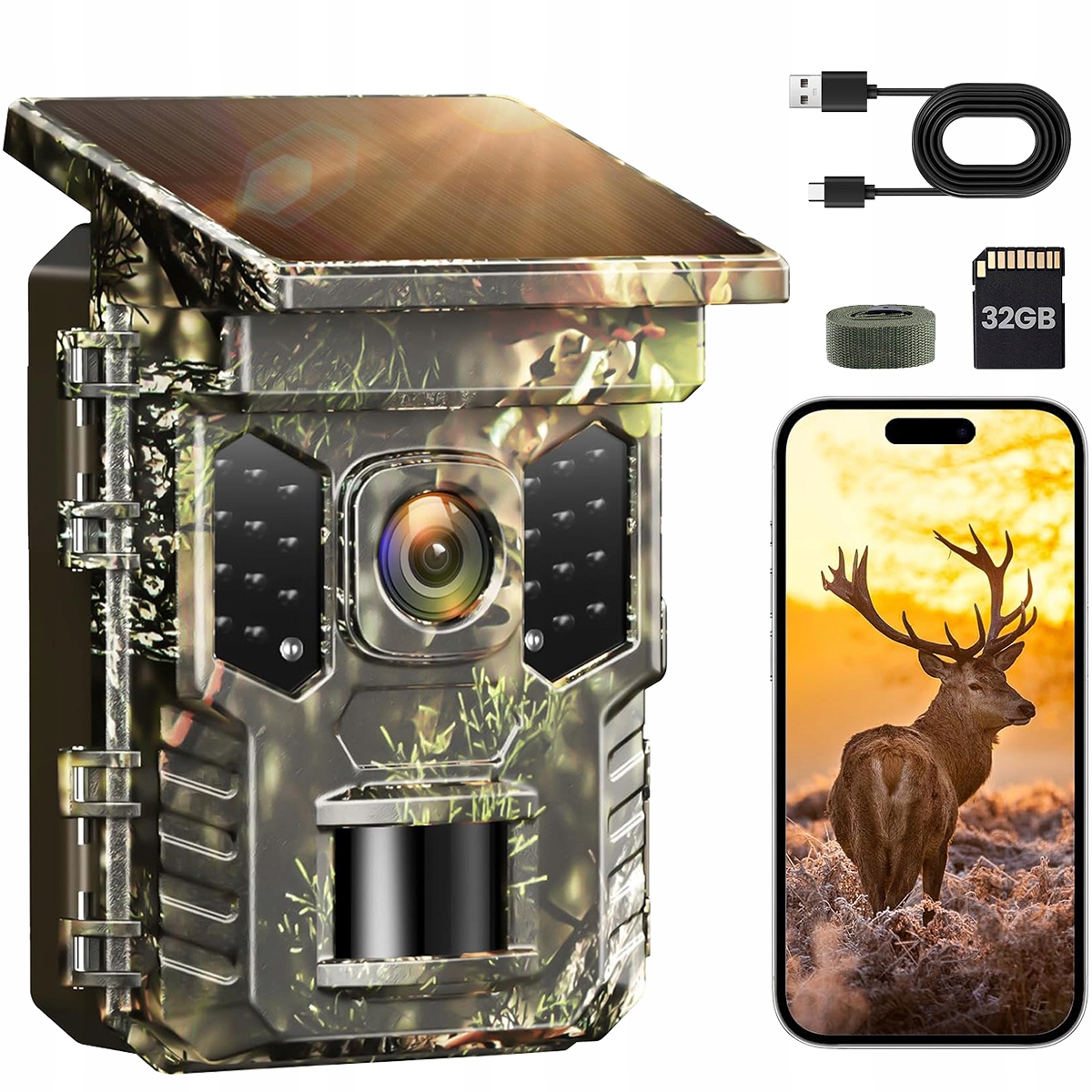 Камера для фотографій дикого характеру з мобільним додатком, Wi-Fi Camera 2,7 к.с. 32 Мп із датчиком руху та пристроєм нічного зору, включаючи 32 ГБ SD-карту, водонепроникний IP66, вбудовану сонячну панель та літій-іонний акумулятор 2600 мАг, тригер 0,2 с (зелена камуфляжа)