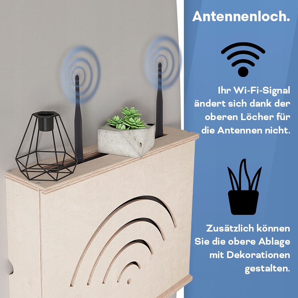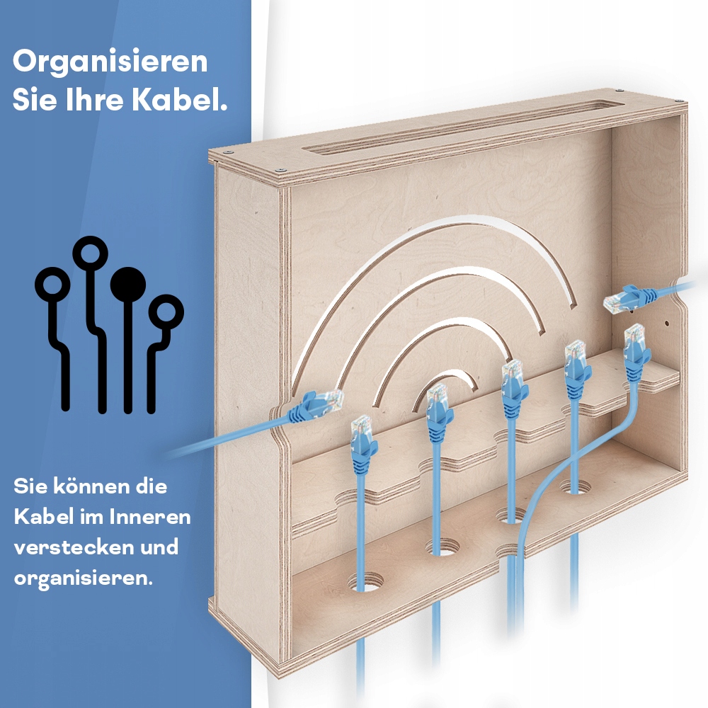шафа маршрутизатора - це не лише привабливий елемент дизайну інтер'єру, але й цікаве рішення для підтримки порядку та збереження місця. Це дає нам безліч можливостей зберігати невелике електронне обладнання разом із кабелем. Він ідеально підходить для домашнього офісу та вітальні. Сучасна поява полиці маршрутизатора ідеально впишеться в будь -яку кімнату. Розміри коробки відповідали для розміщення маршрутизатора або іншого невеликого електронного обладнання з кабелем. Внутрішня полиця дає вам можливість коригувати на двох рівнях, що дозволяє відповідати продукту з нашими потребами. Весь виготовлений з фанери, довговічного та естетичного матеріалу.