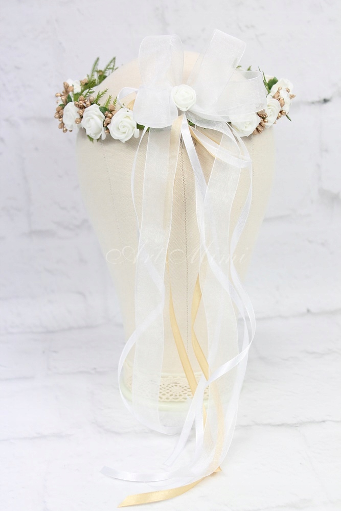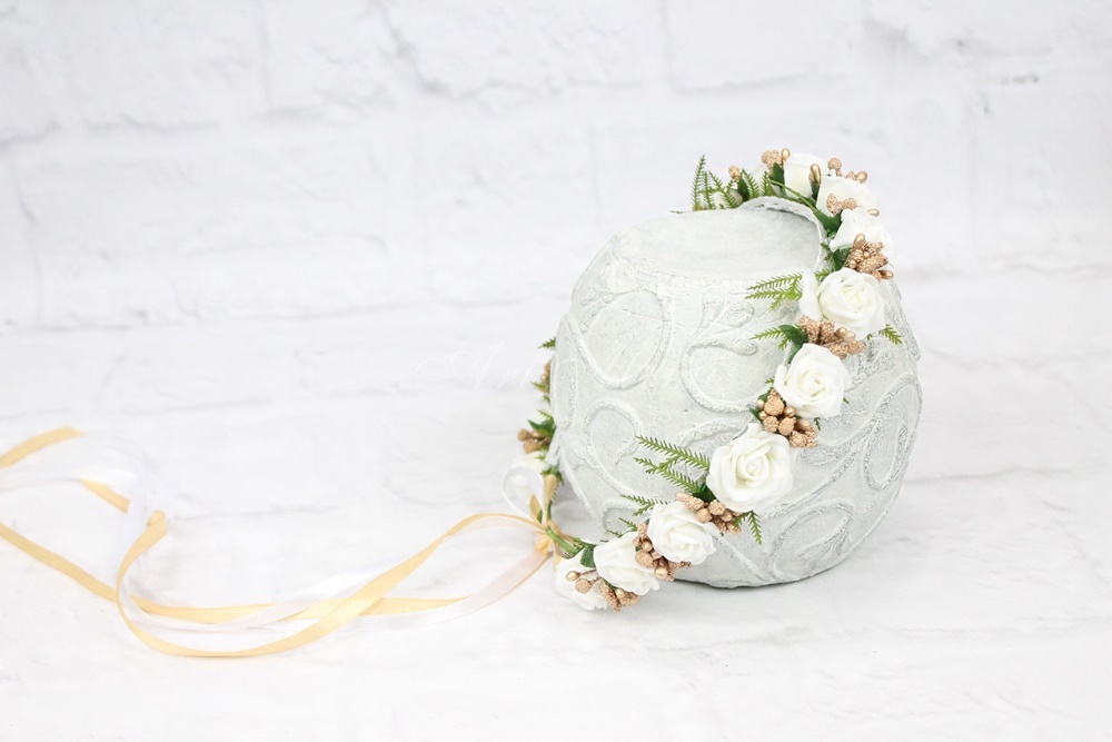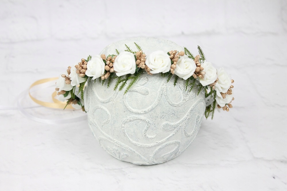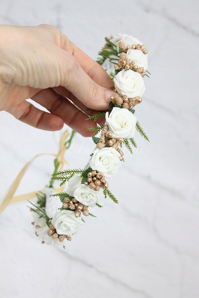 Wianek komunijny subtelny ZŁOTY paproć PEREŁKI